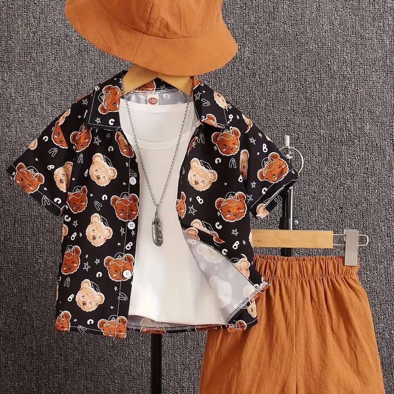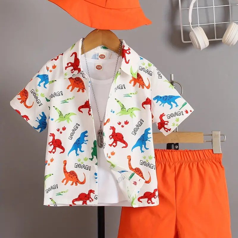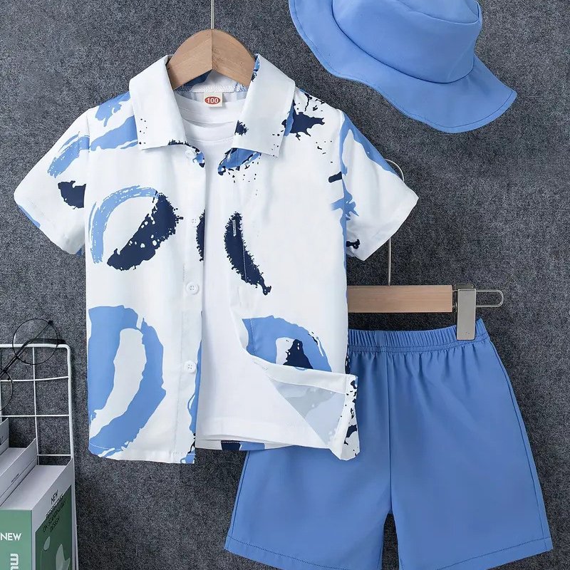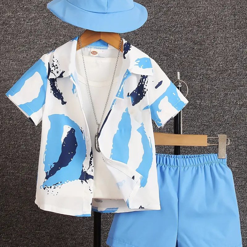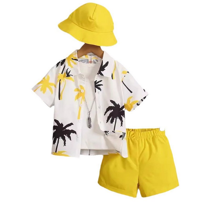 Boys Fashion Casual Coconut Tree Print Short Sleeve Blouse Loose Shorts Two-Piece Set