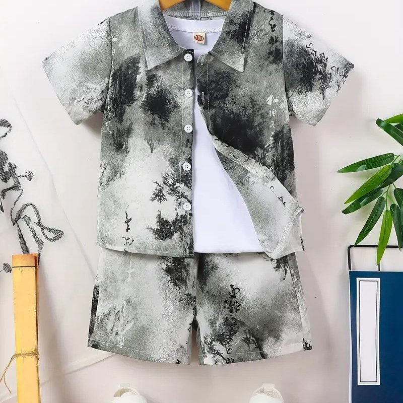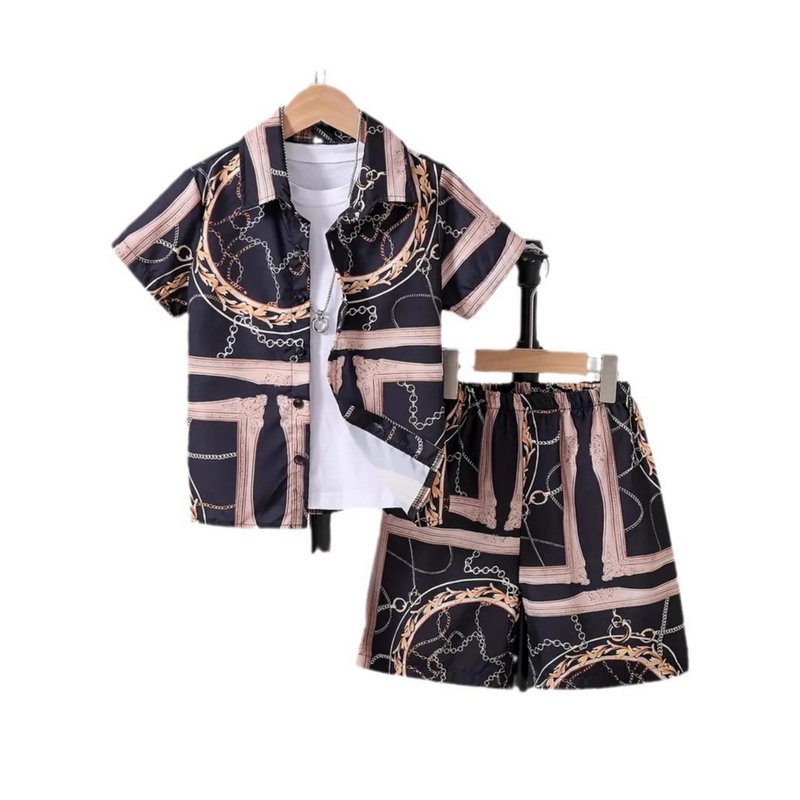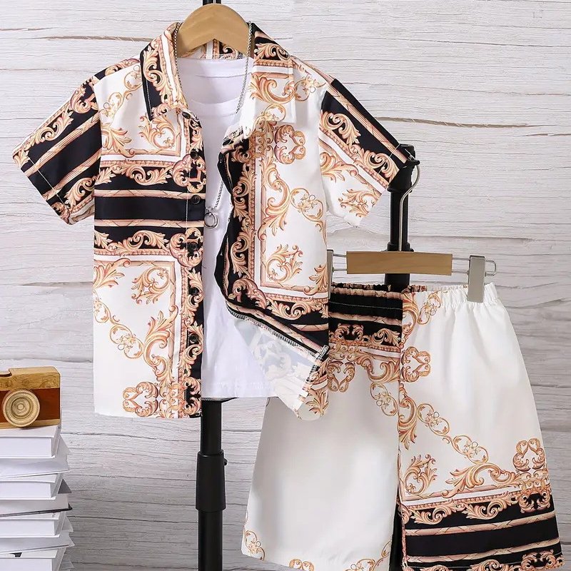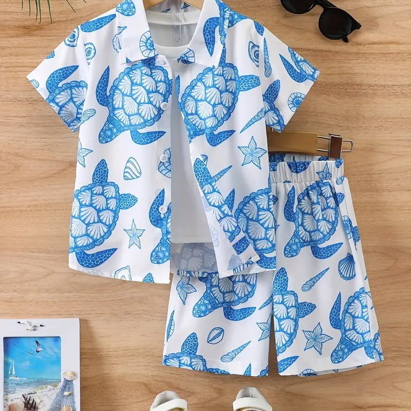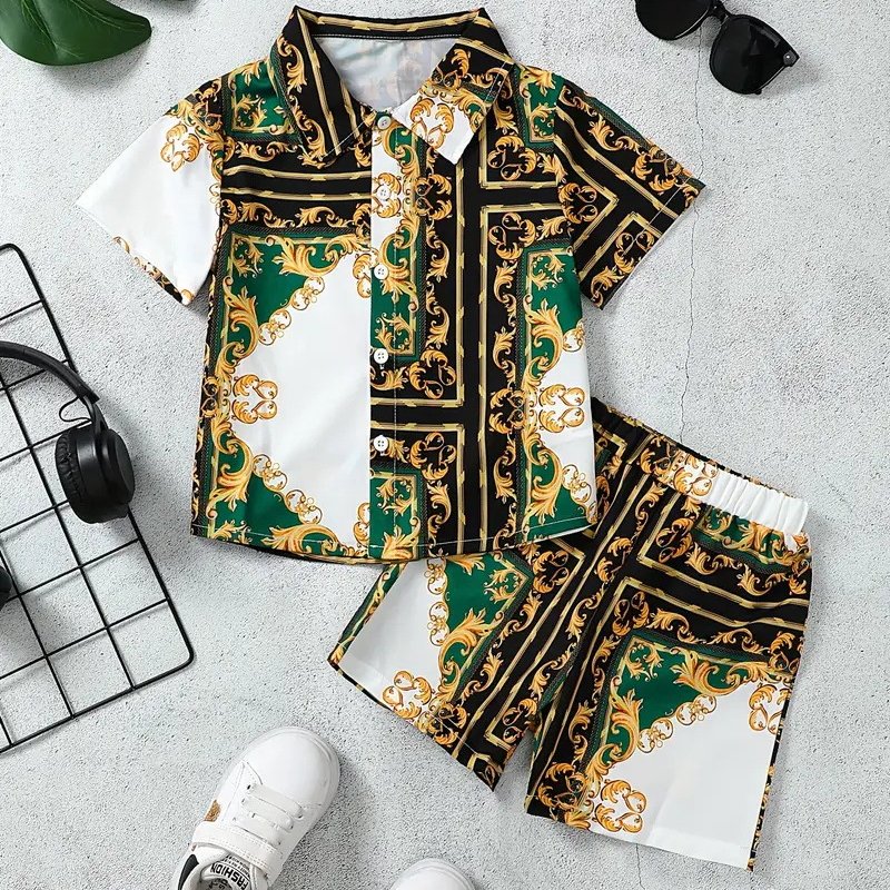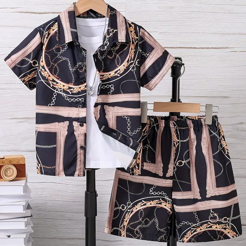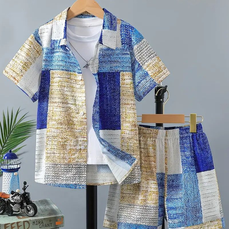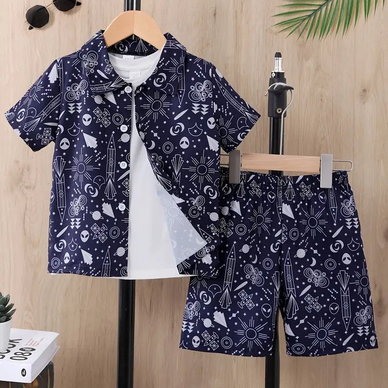 Boys Fashion Casual Vacation Printed Short-Sleeve Blouse Loose Shorts Two-Piece Set