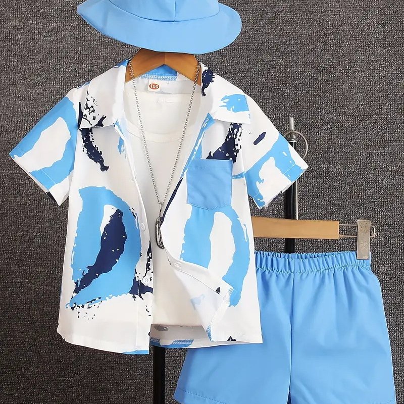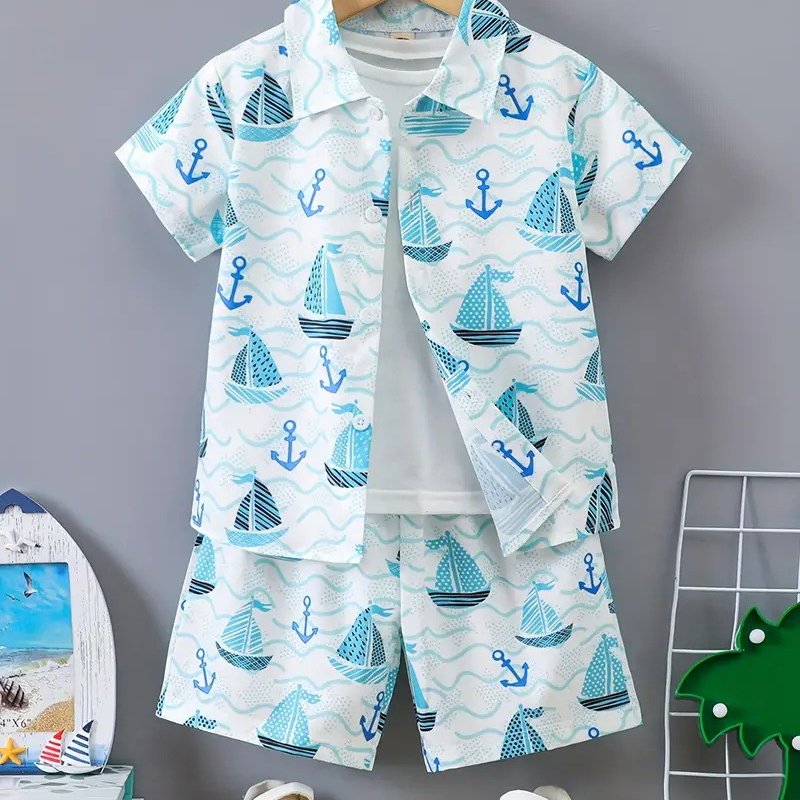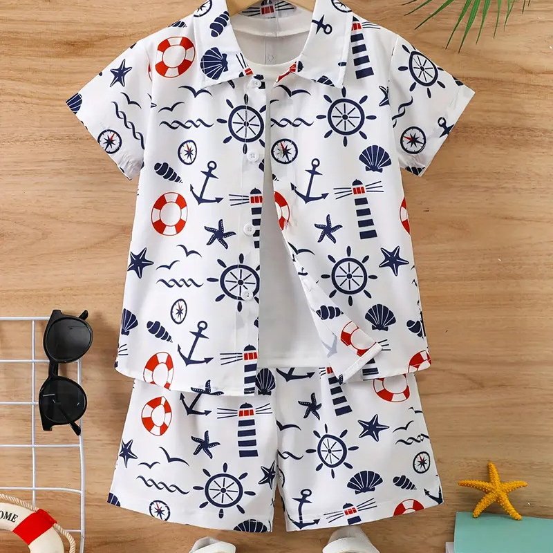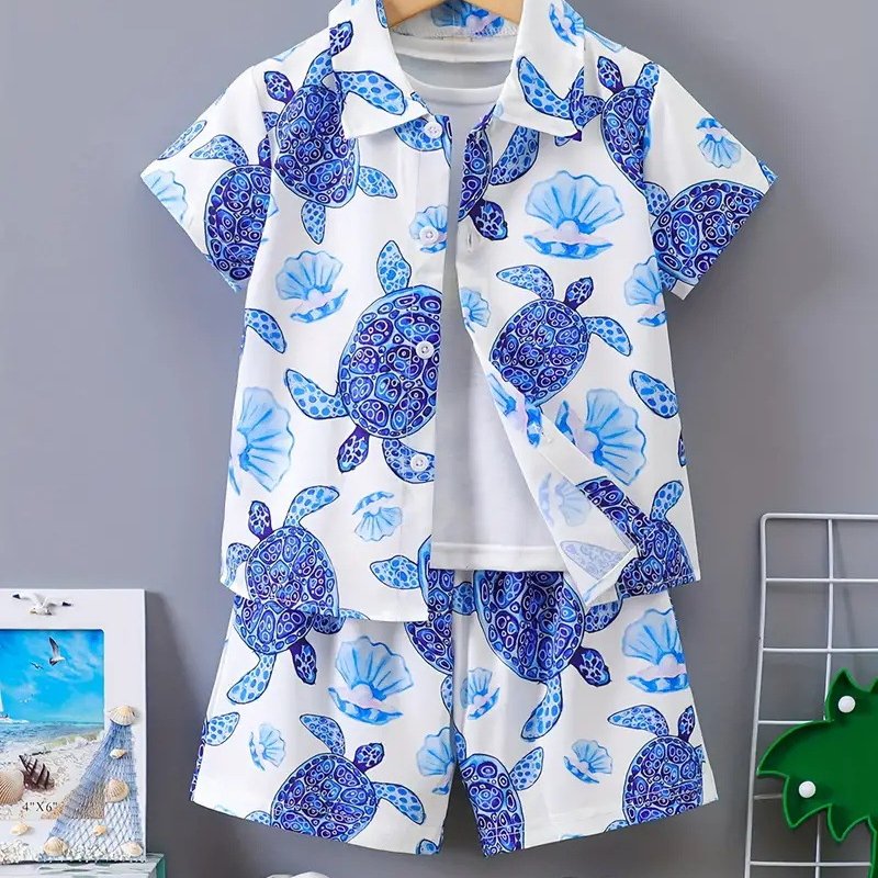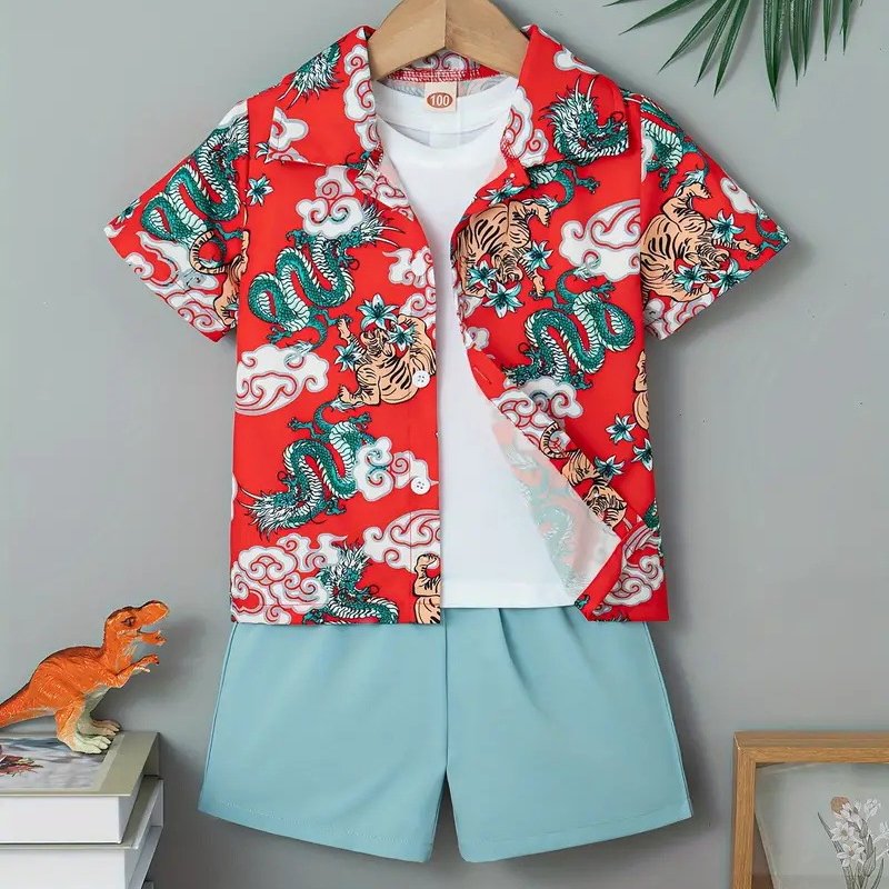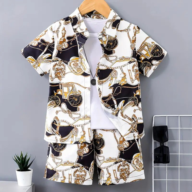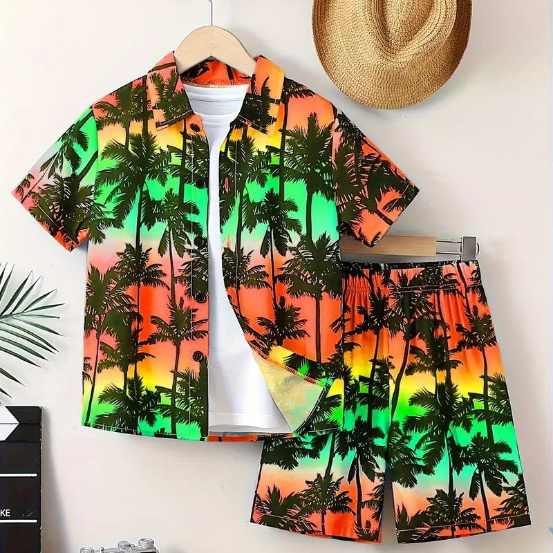 Boys Fashion Casual Vacation Printed Short-Sleeve Blouse Loose Shorts Two-Piece Set