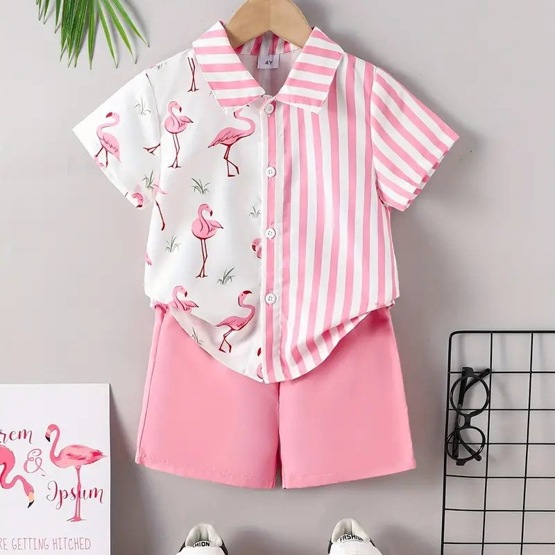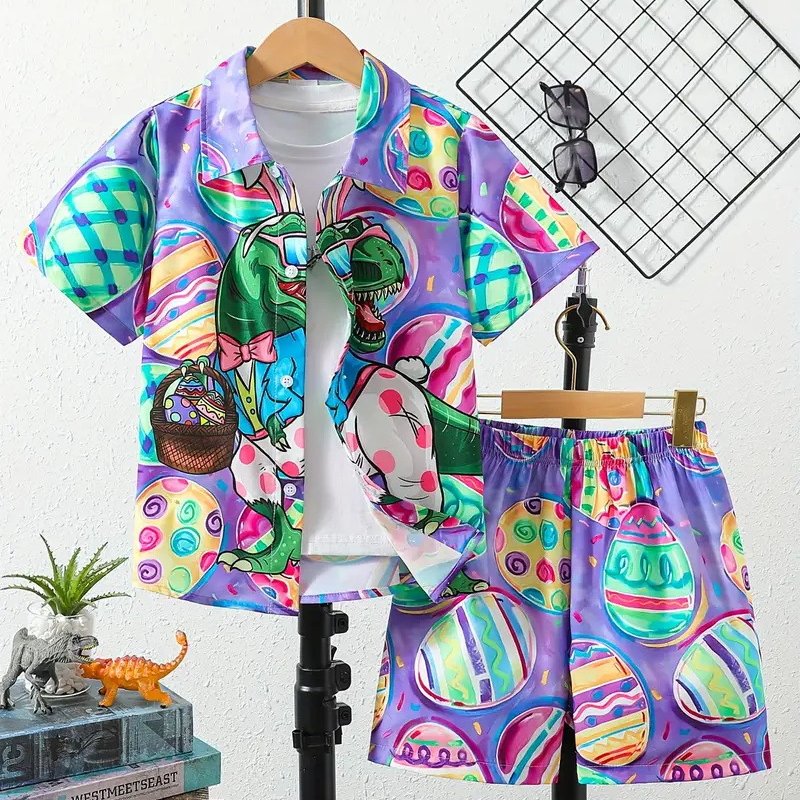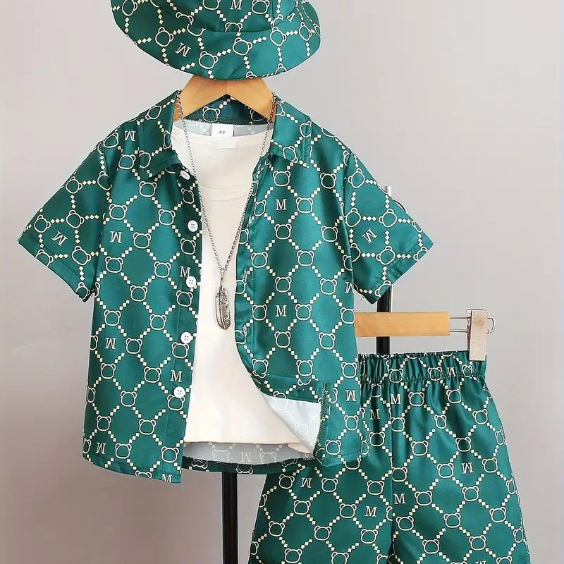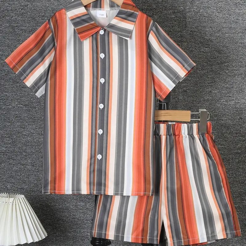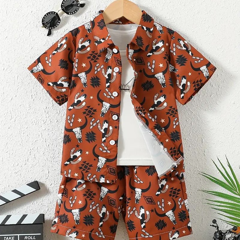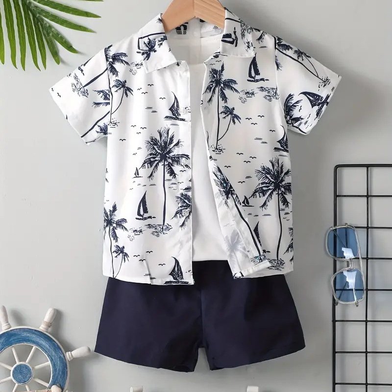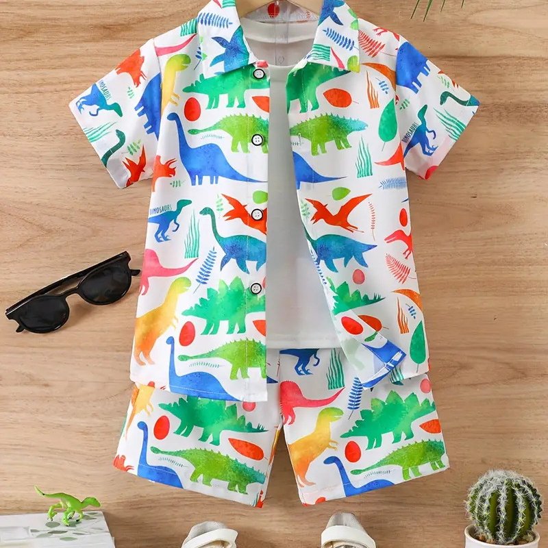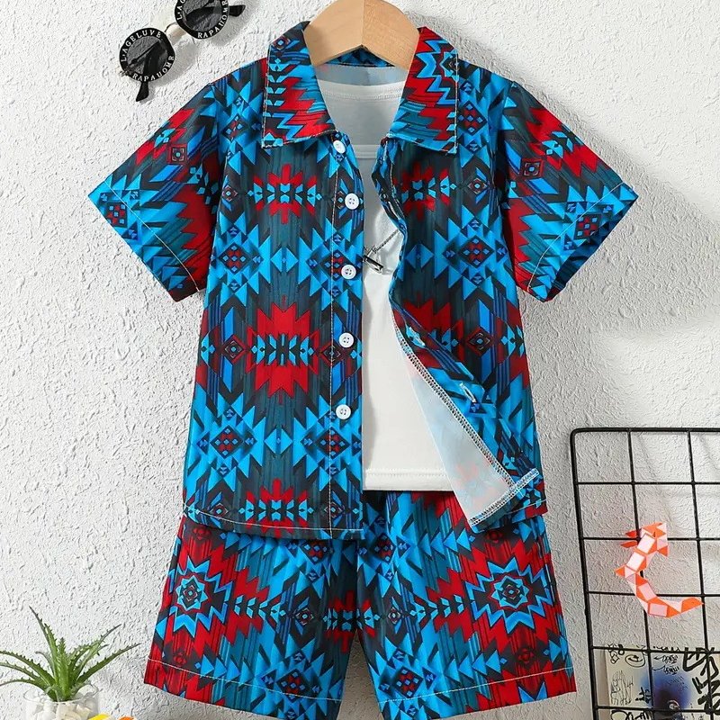 Boys Fashion Casual Vacation Printed Short-Sleeve Blouse Loose Shorts Two-Piece Set