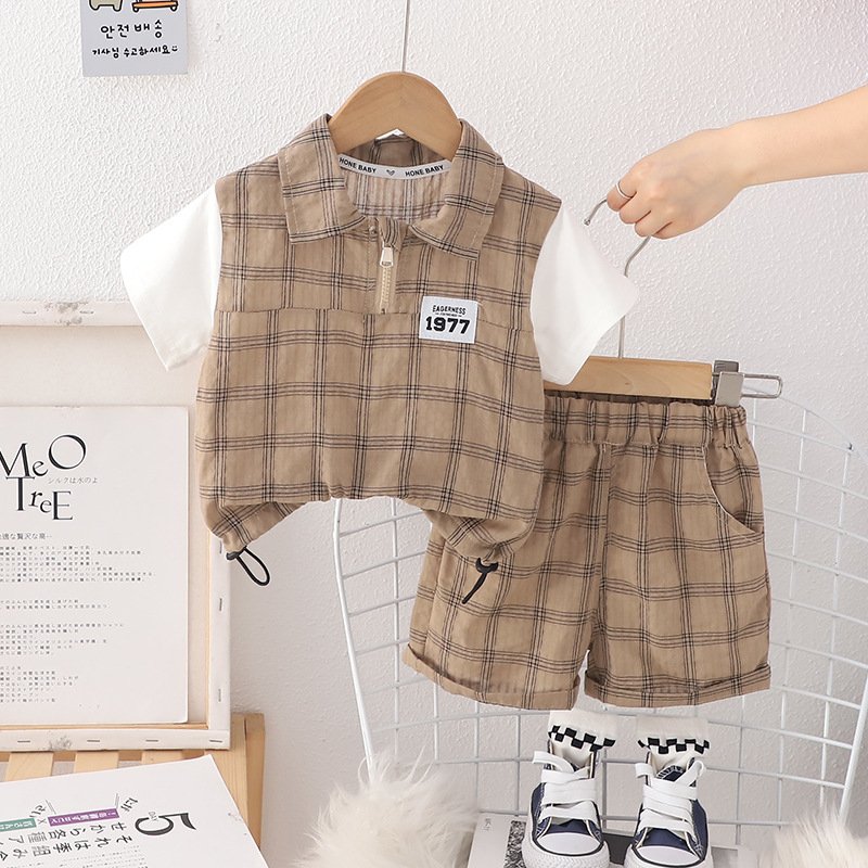 Boys Fashionable Plaid Shirt And Shorts Two-Piece Set