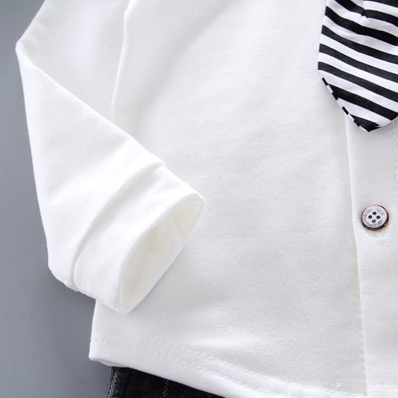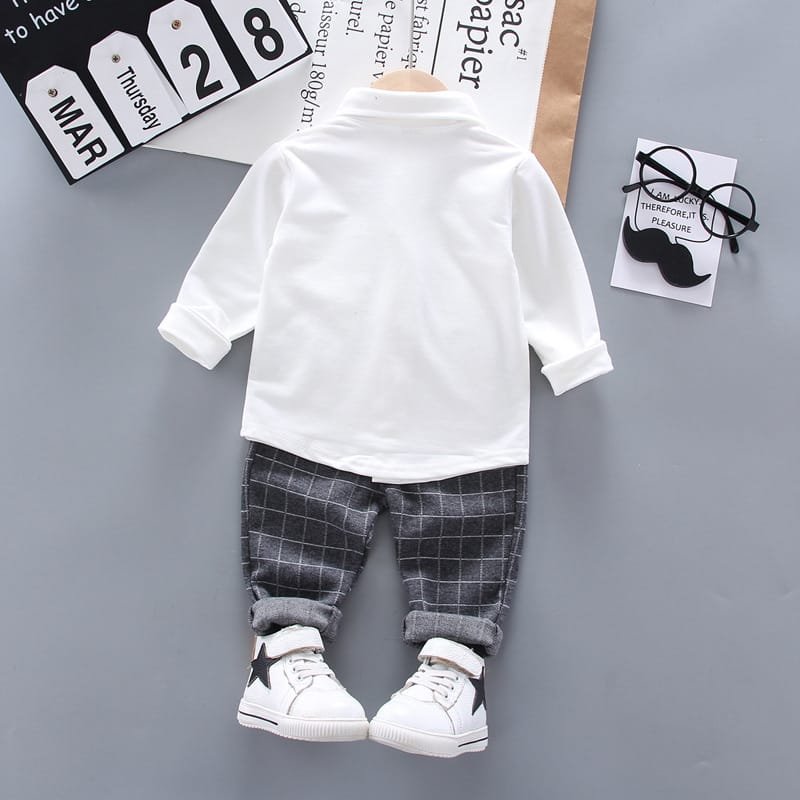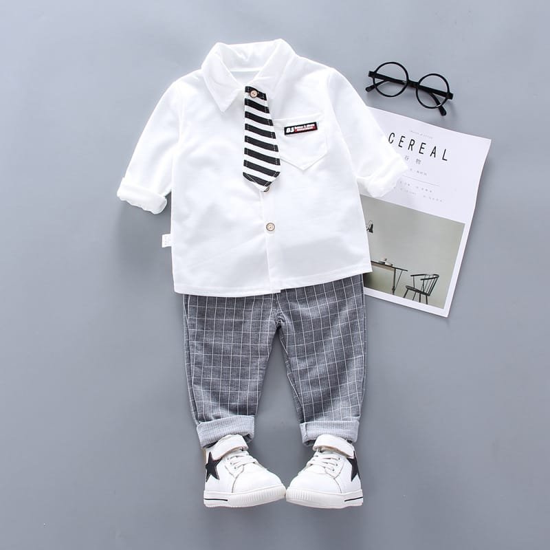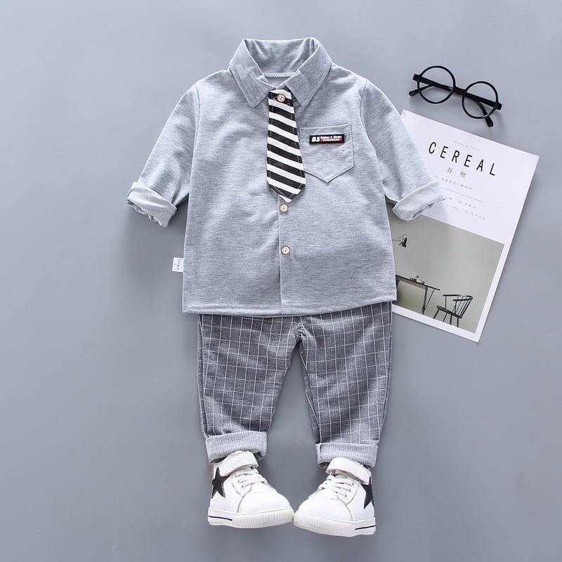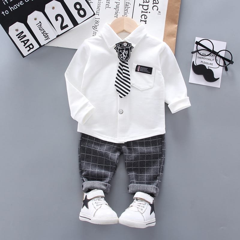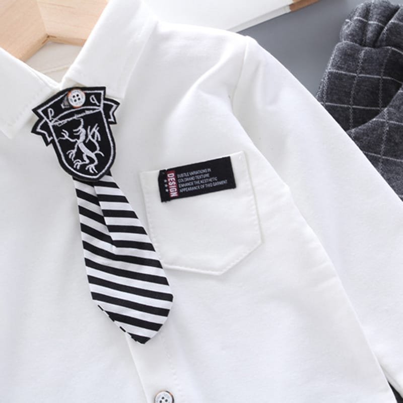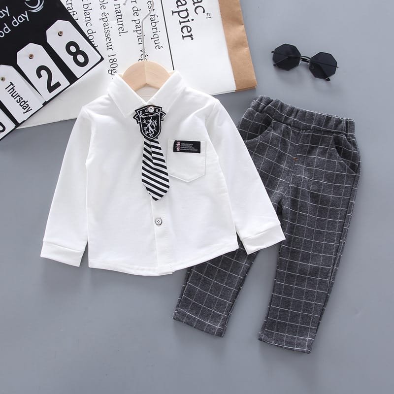 Boys Single-breasted Lapel Design Shirt And Plaid Pants Set