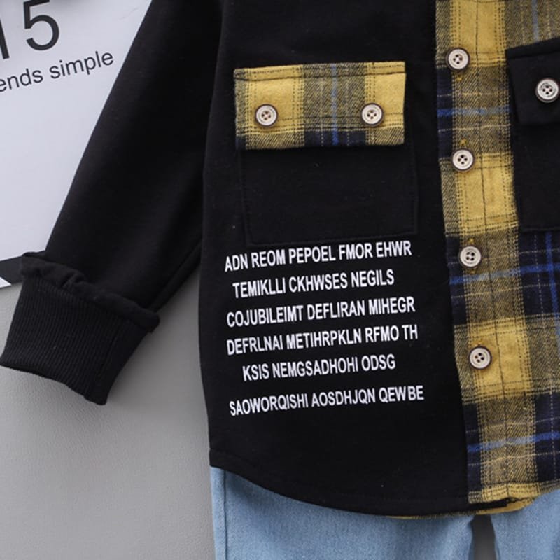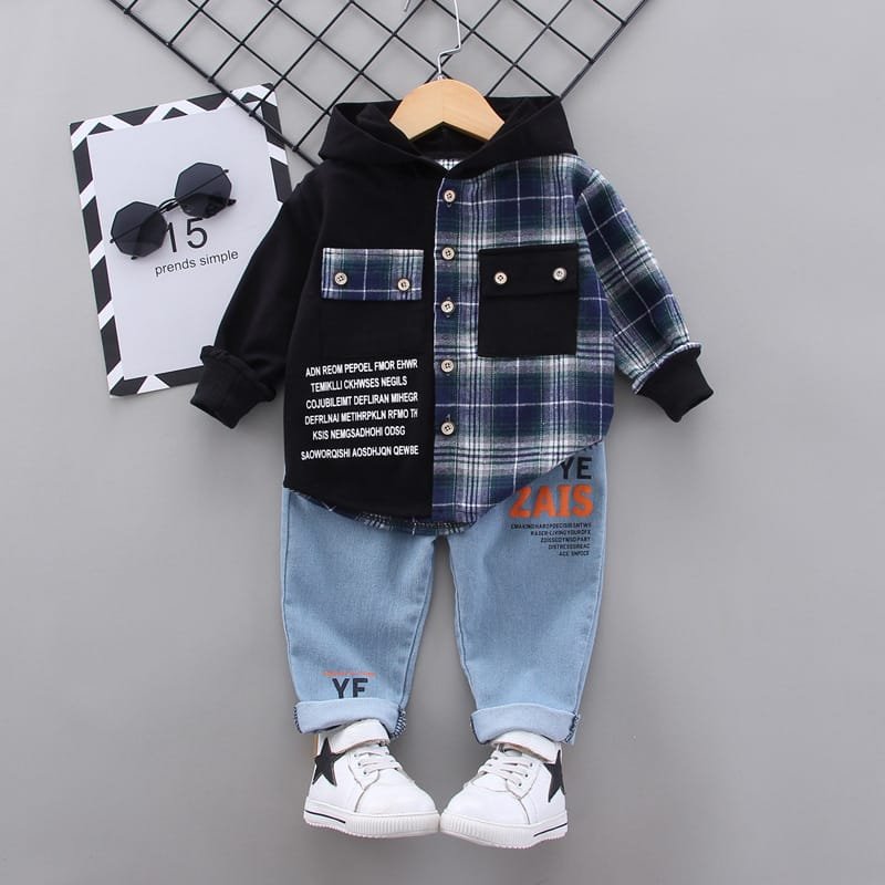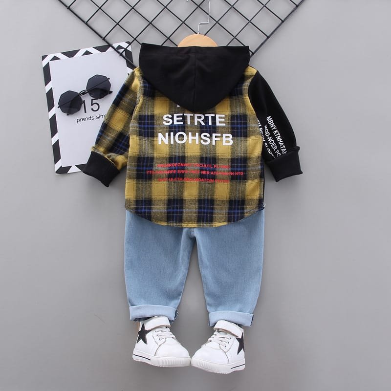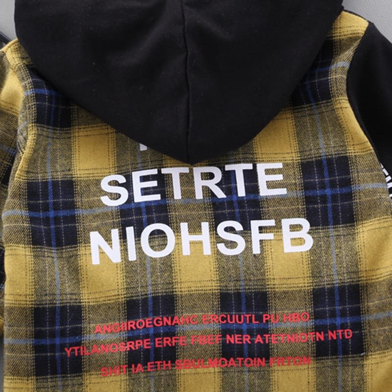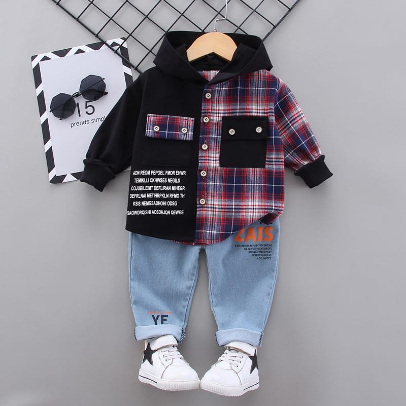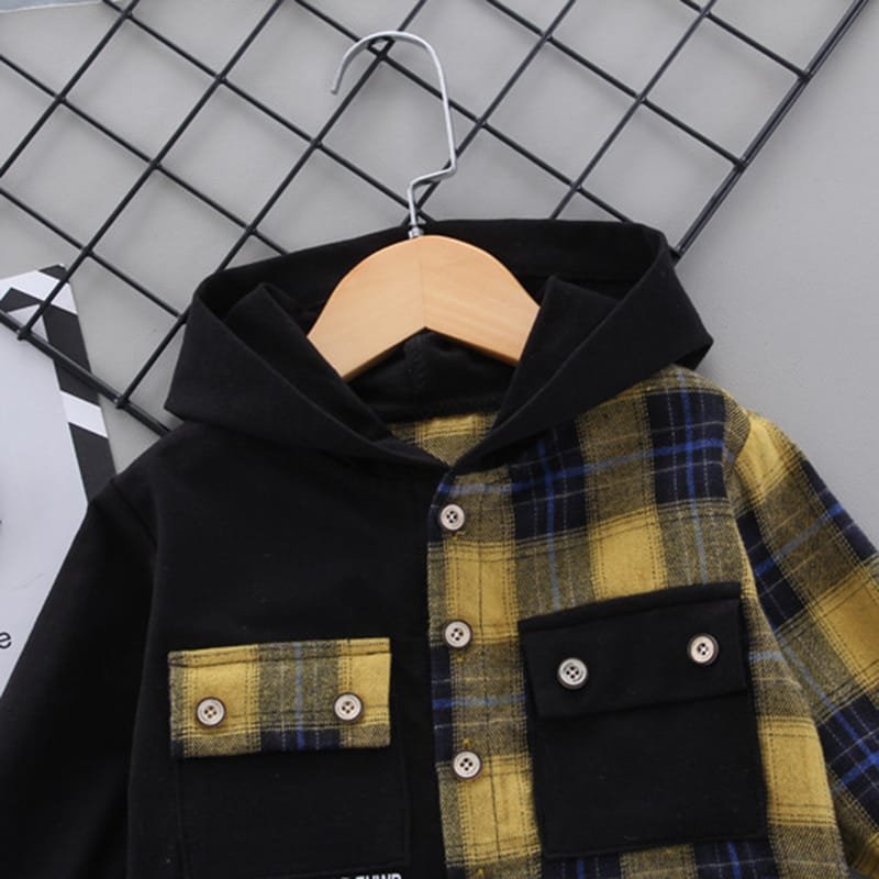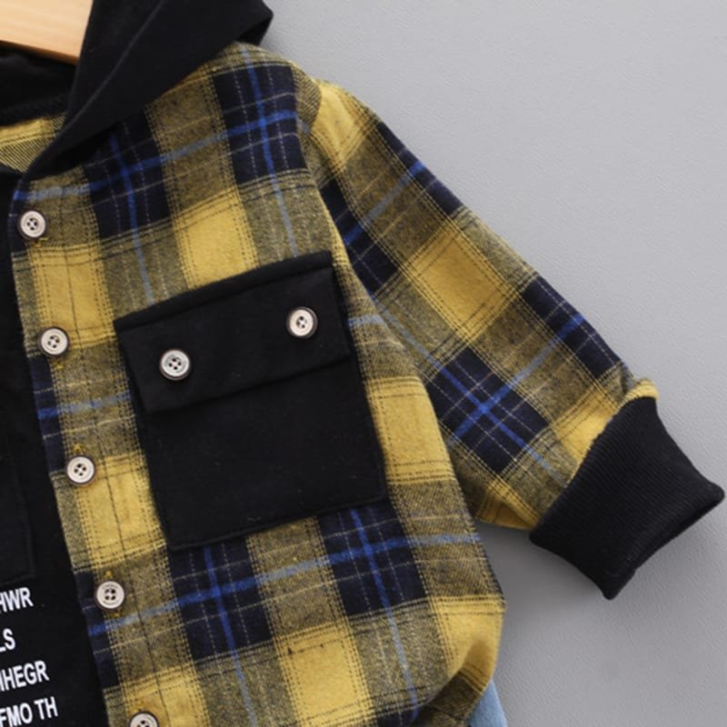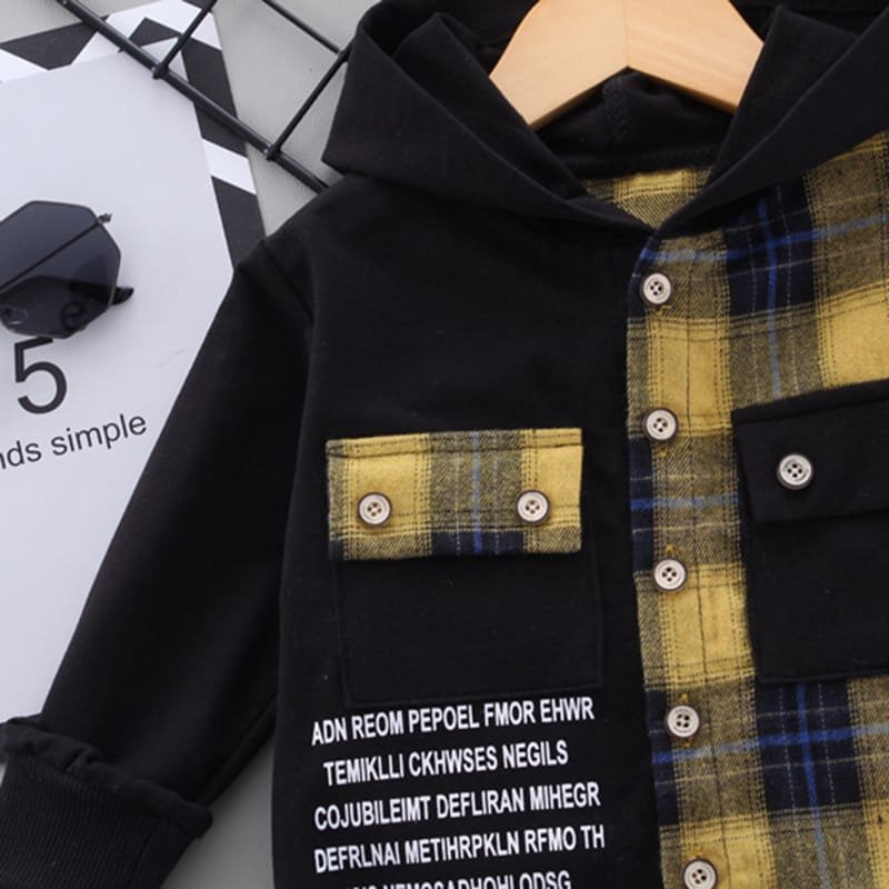 Boys Single-breasted Plaid Hooded Shirt And Pants Set