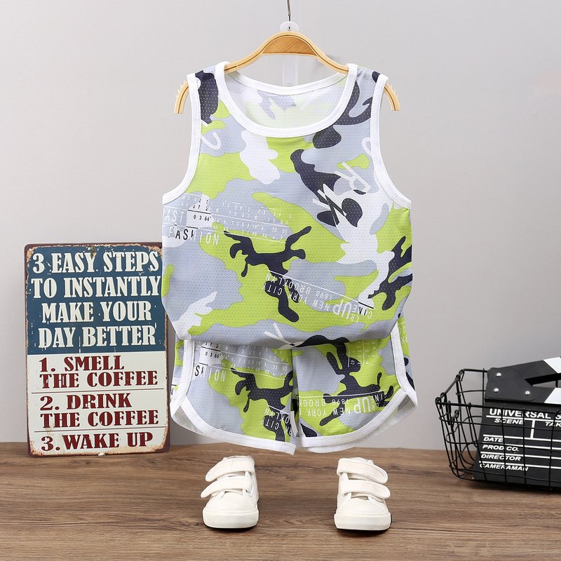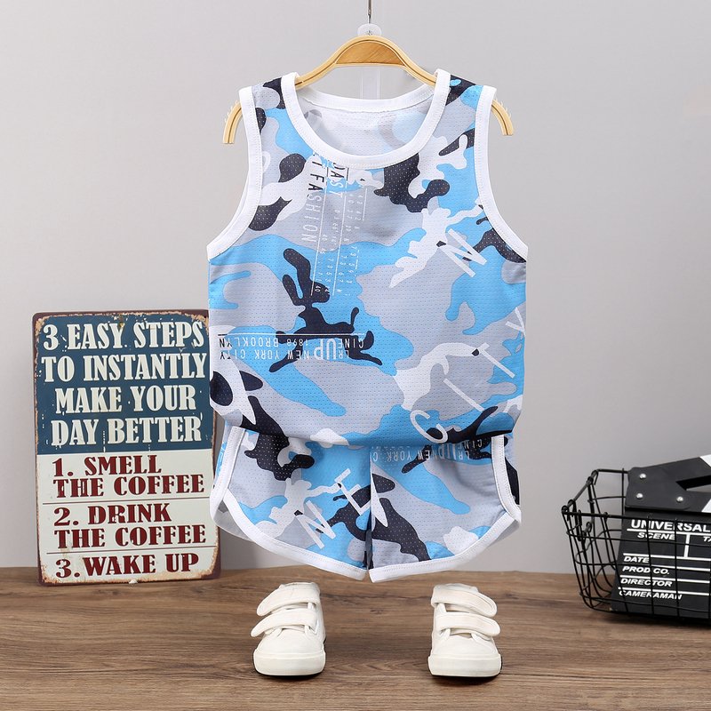 Boys Sporty Round Neck Sleeveless Hollow Out All Over Print T-Shirt And Shorts Quick Dry Set