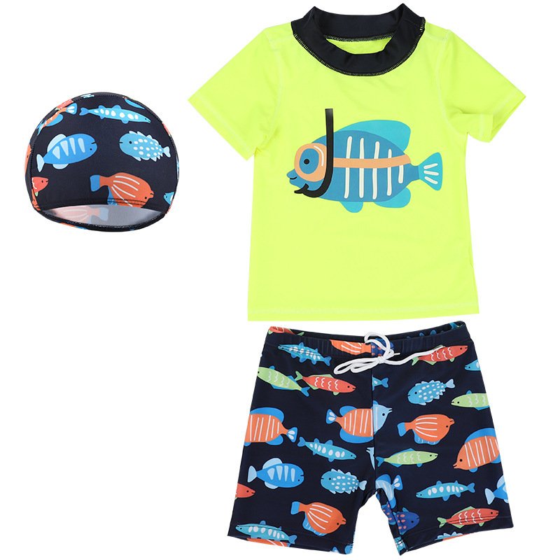 Children Kids Baby Fashion Boys Short Sleeve Cartoon Fish Print Swimsuit 3pcs Set
