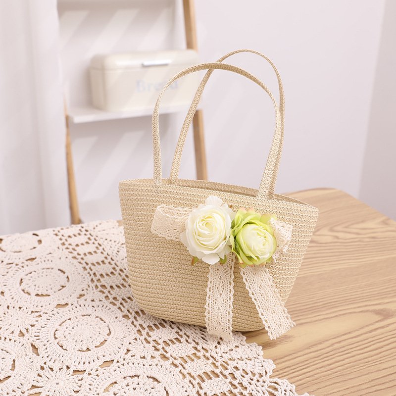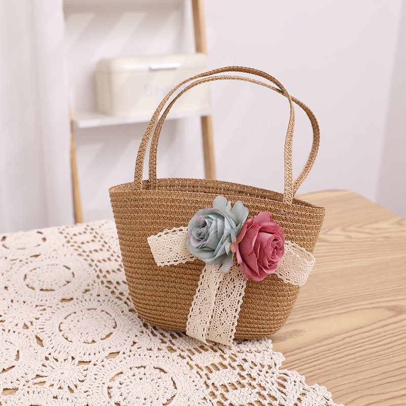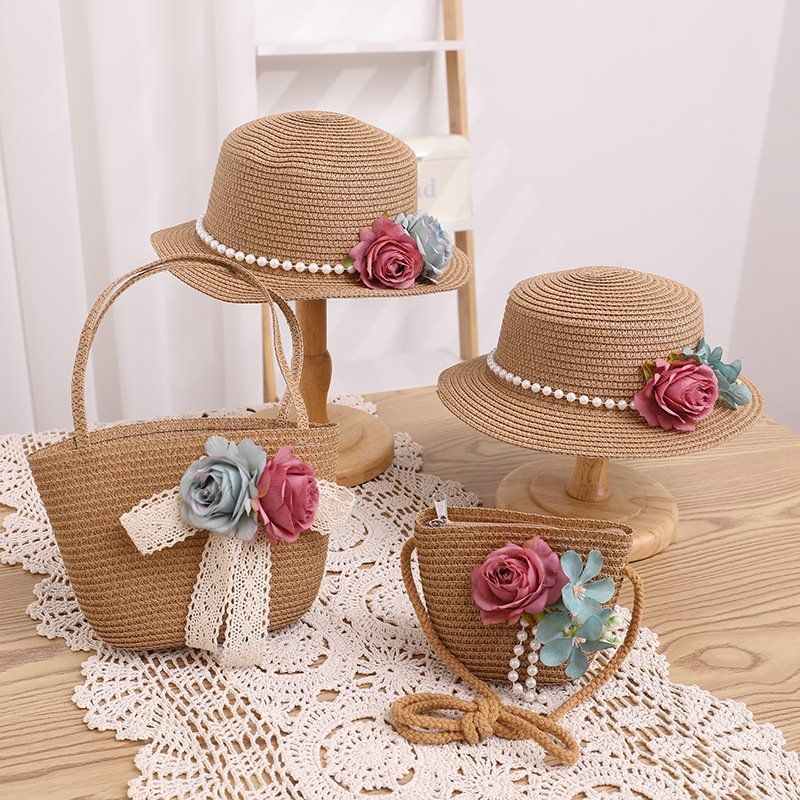 Children Kids Baby Fashion Cartoon Flower Lace Straw Hat Crossbody Bag