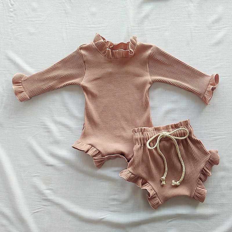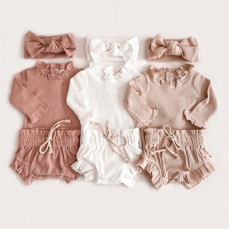 Children Kids Baby Fashion Cotton Rib-Knit Ear-Rimmed Romper And Shorts Two-Piece Set
