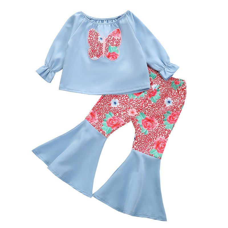 Children Kids Baby Fashion Girls Butterfly Tops And Floral Print Pants 2pcs Set