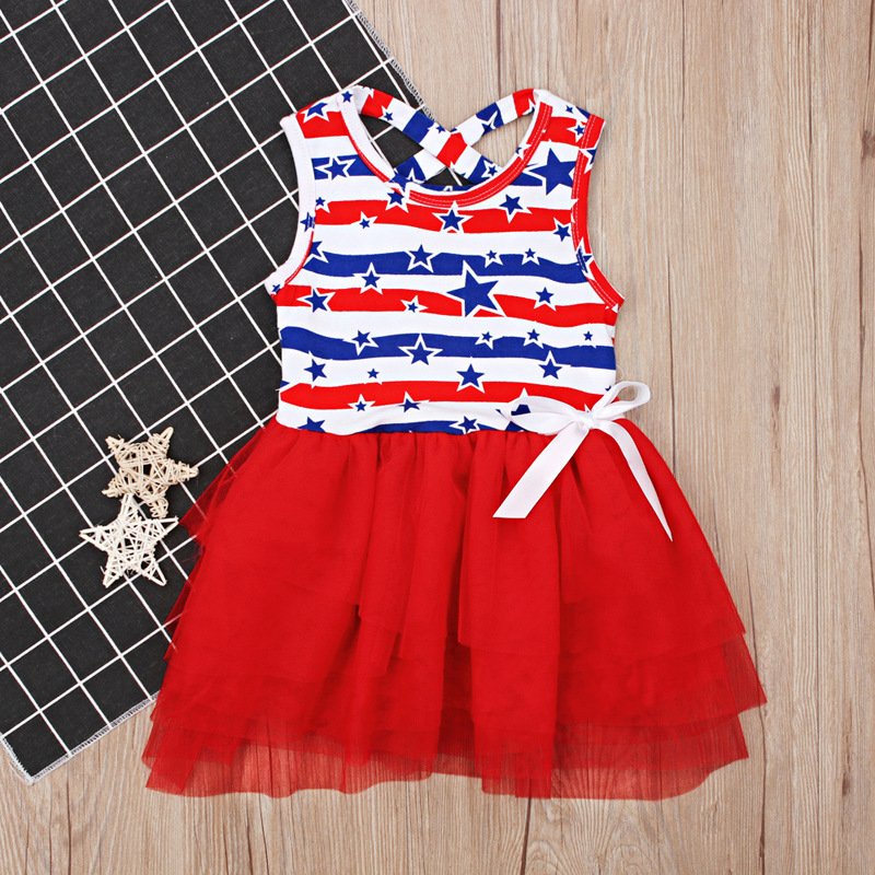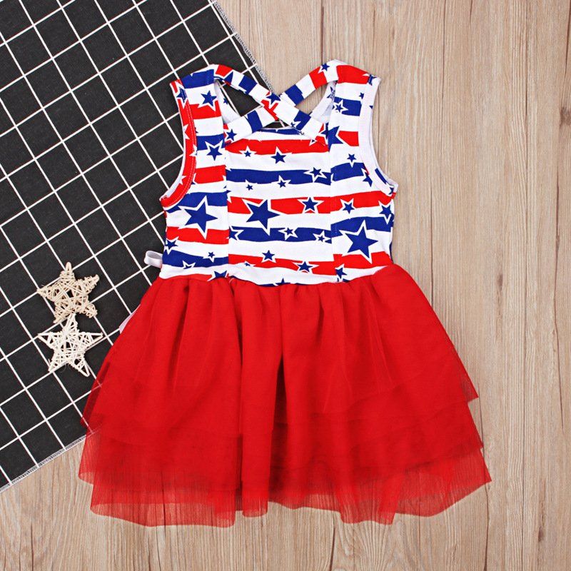Children Kids Baby Fashion Girls Casual Basics Sleeveless Flag Independence Day Star Print Mesh Dress