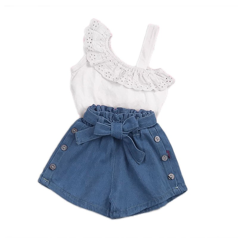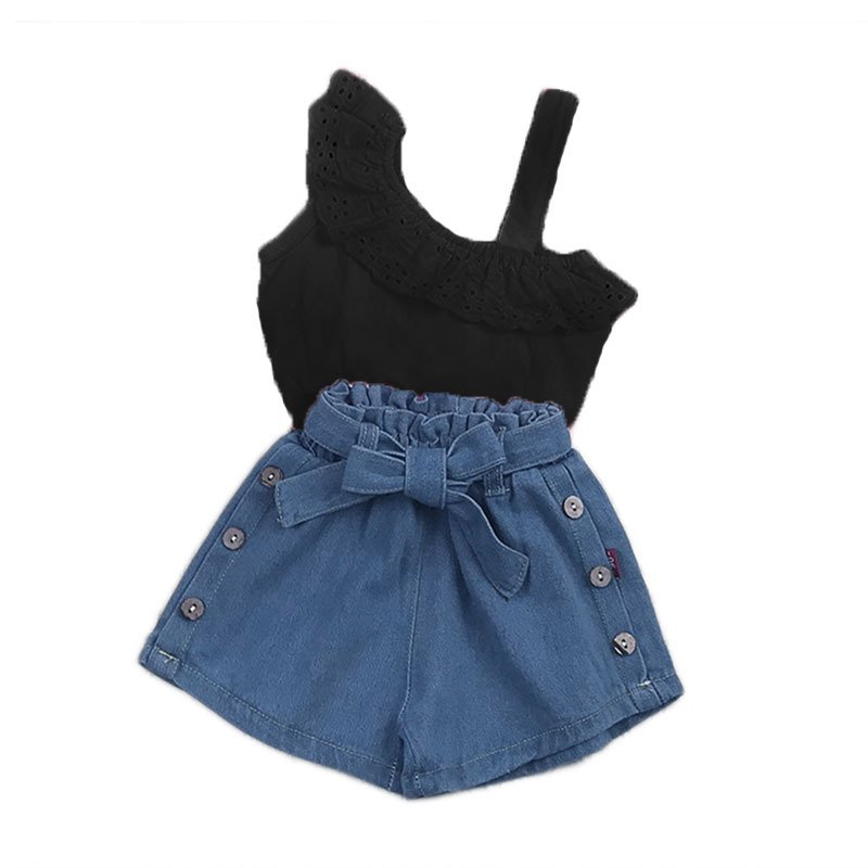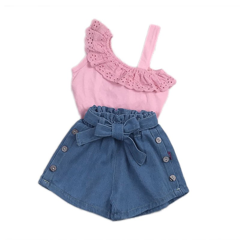 Children Kids Baby Fashion Girls Casual One Shoulder Strap Sleeveless Lace Top And Shorts 2pcs Set