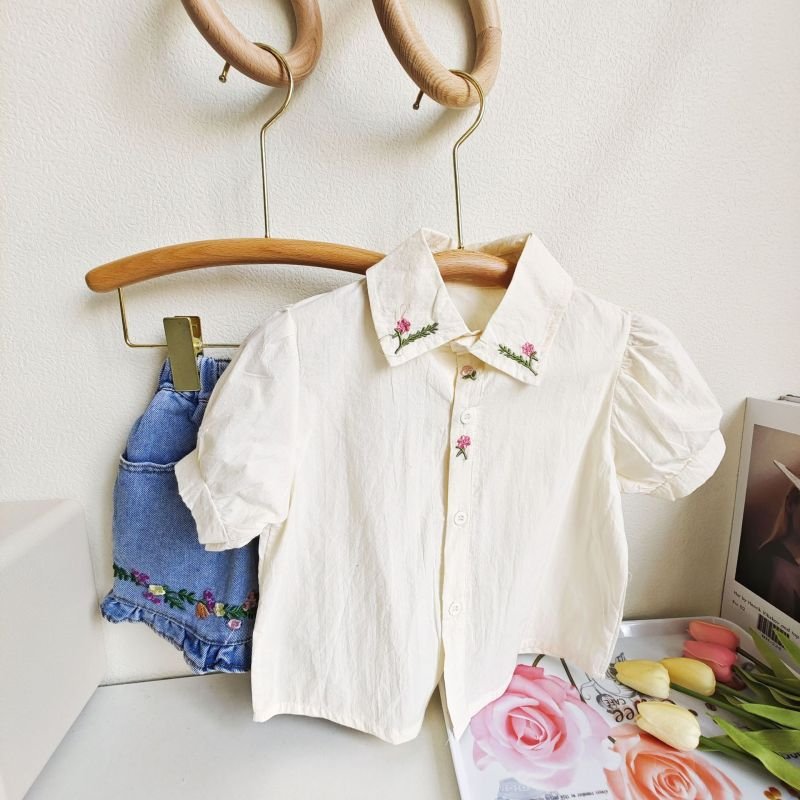 Children Kids Baby Fashion Girls Casual Short Sleeve Flower Embroidery Blouse And Denim Shorts 2pcs Set