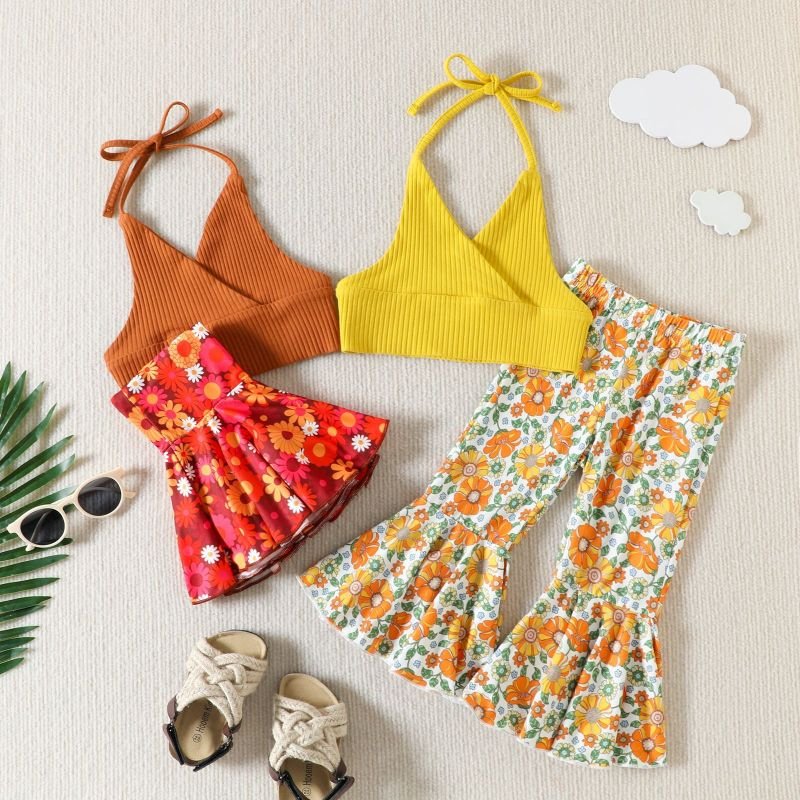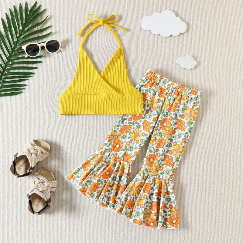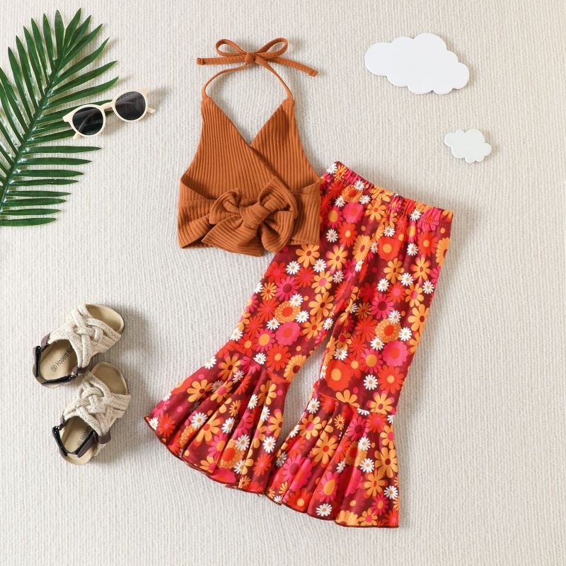 Children Kids Baby Fashion Girls Halter Neck Backless Top And Flared Pants 2pcs Set