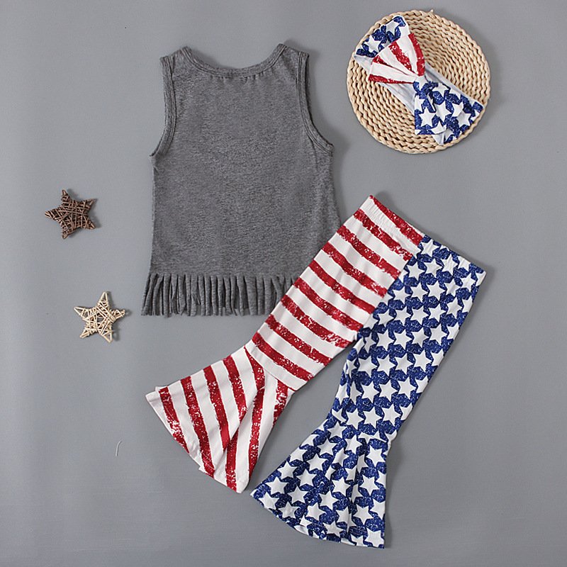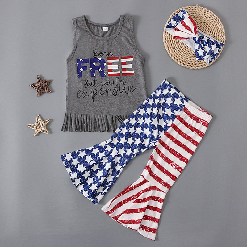 Children Kids Baby Fashion Girls Independence Day Flag Sleeveless Letter Print T-Shirt And Pants Set