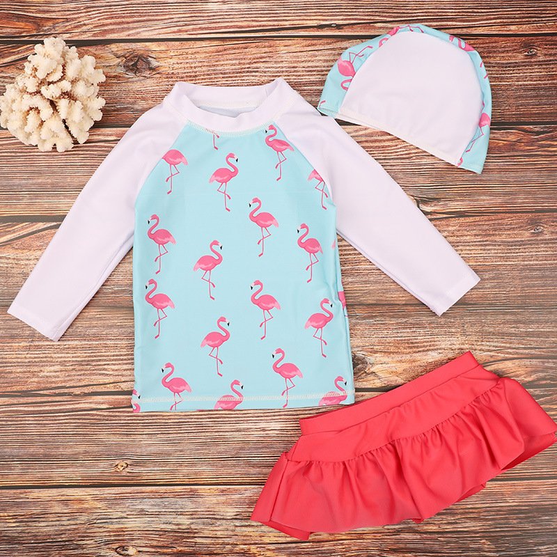 Children Kids Baby Fashion Girls Long Sleeve Quick-Drying Cartoon Flamingo Print Swimsuit 3pcs Set