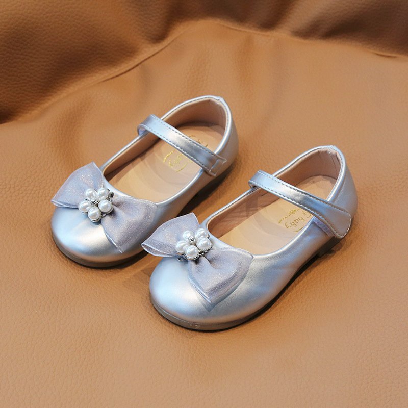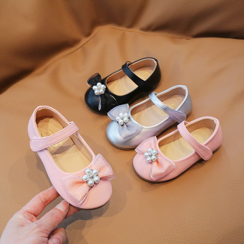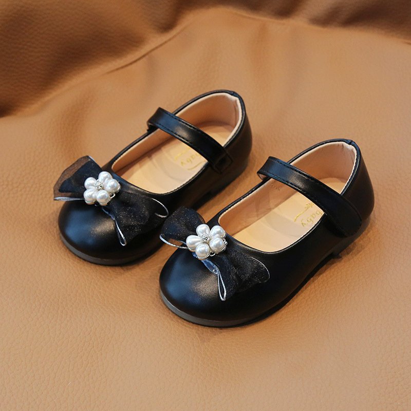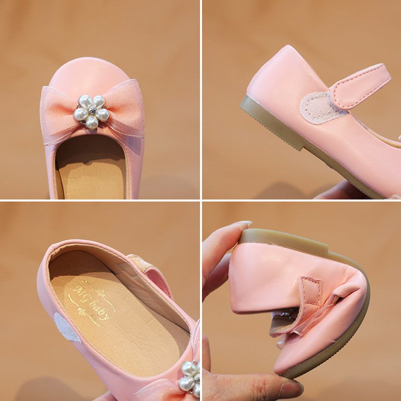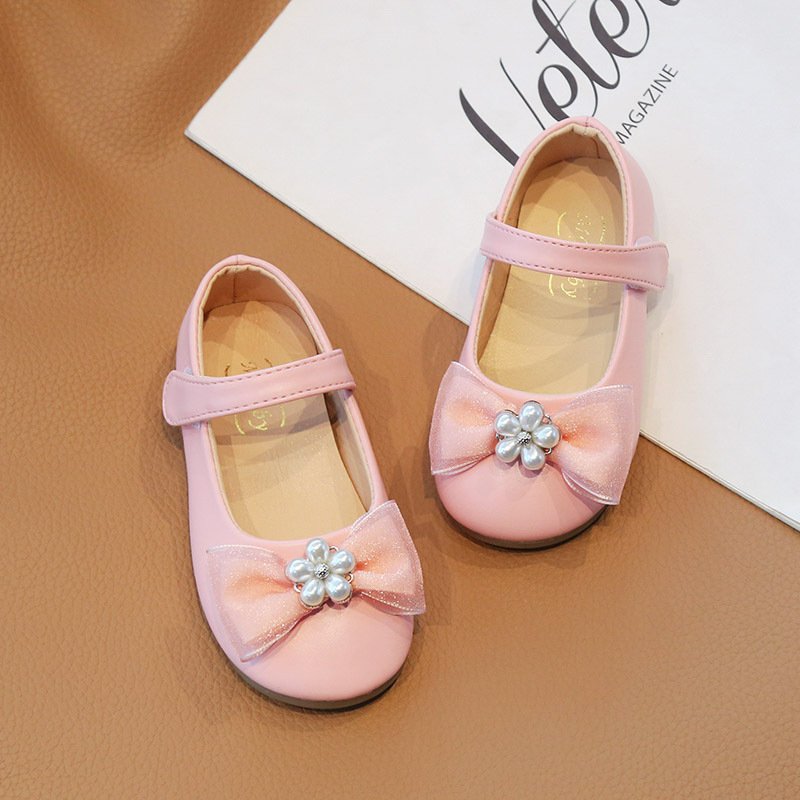 Children Kids Baby Fashion Girls Mesh Pearl Flower Bow Pu Leather Flat Shoes