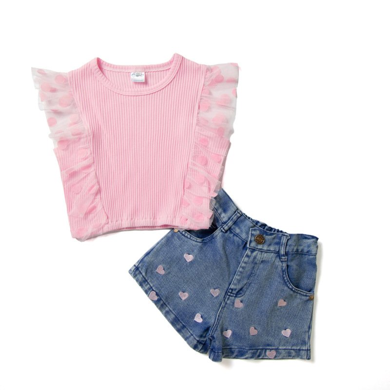 Children Kids Baby Fashion Girls Mesh Sleeveless Top And Floral Denim Shorts 2pcs Set
