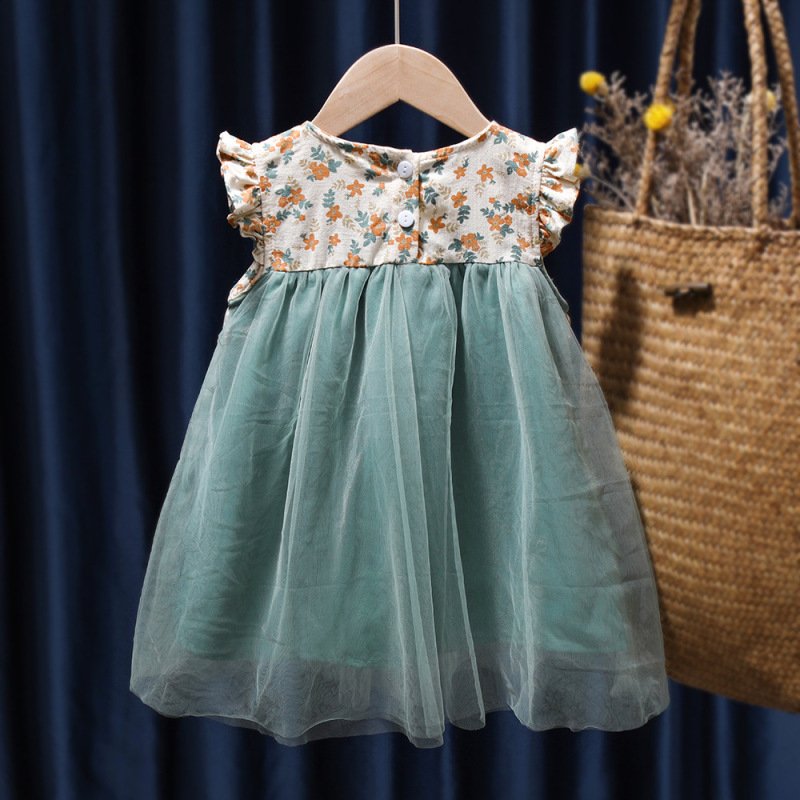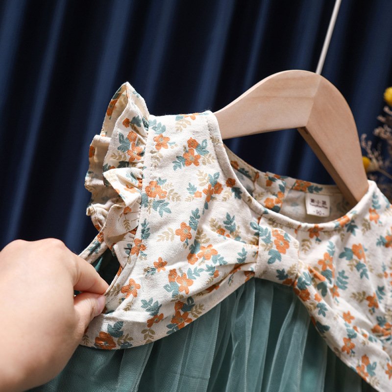 Children Kids Baby Fashion Girls Ruffle Sleeve Floral Print Mesh Stitching Princess Dress