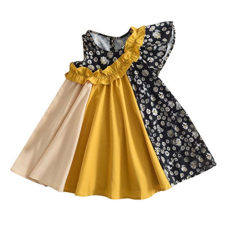 Children Kids Baby Fashion Girls Ruffle Sleeve Flower Print Color-Blocking Princess Dress