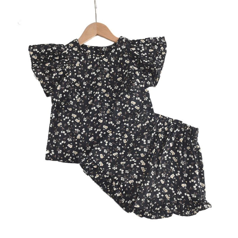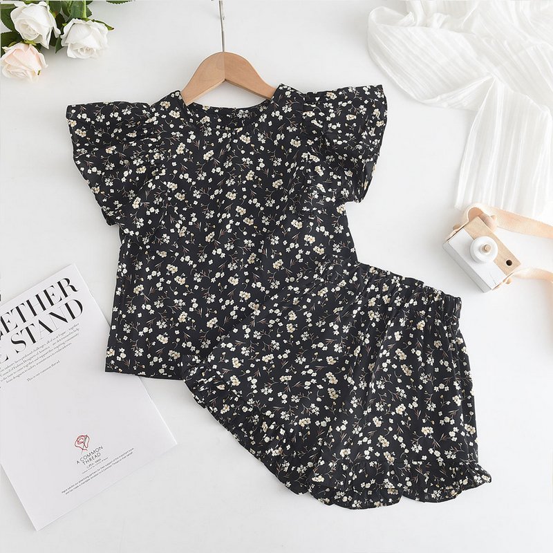 Children Kids Baby Fashion Girls Ruffle Sleeve Flower Printed Top And Shorts 2pcs Set