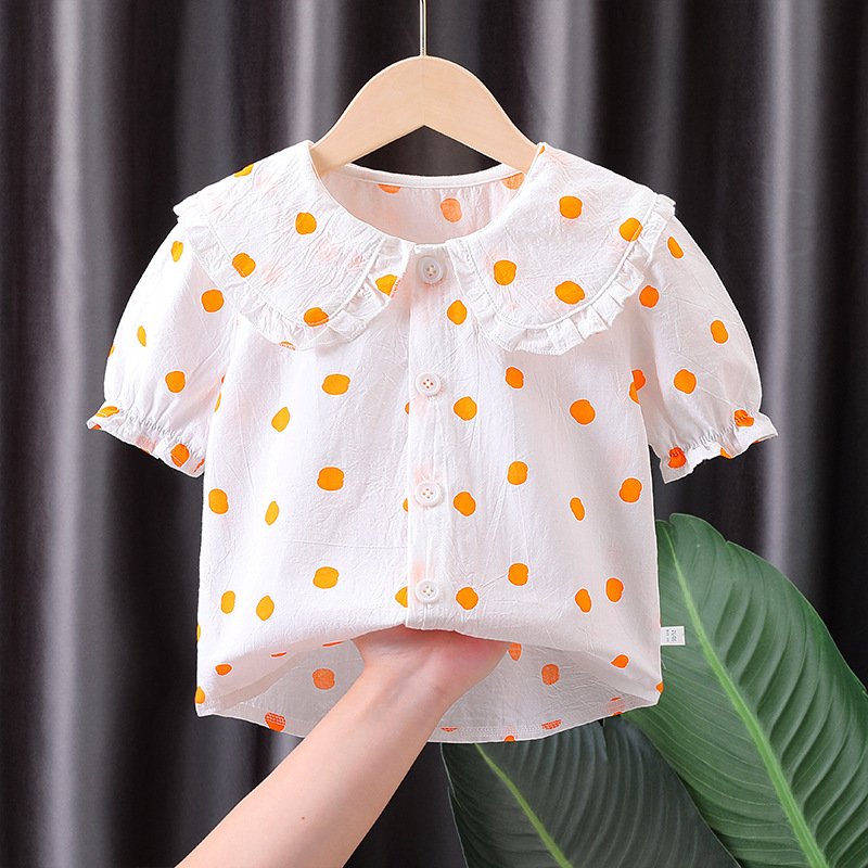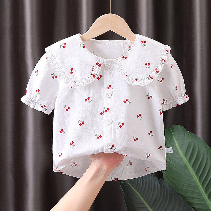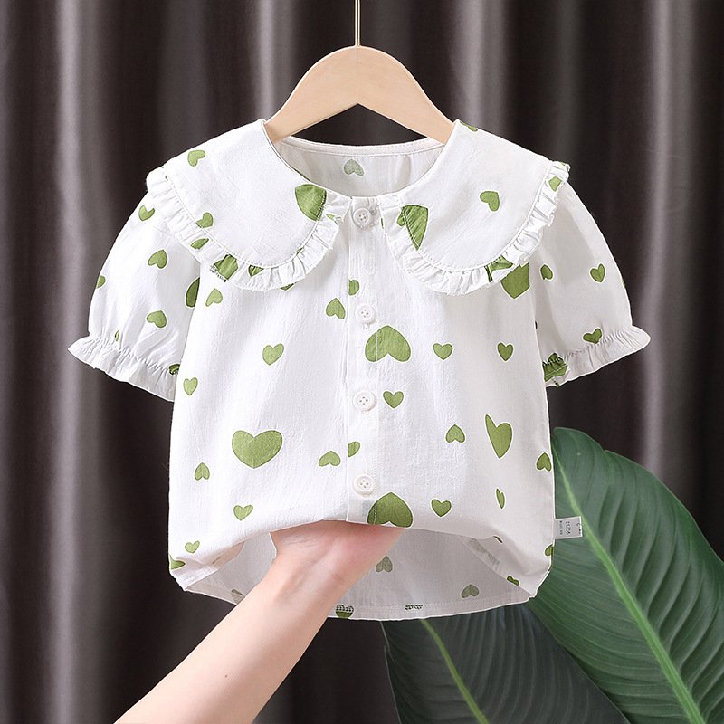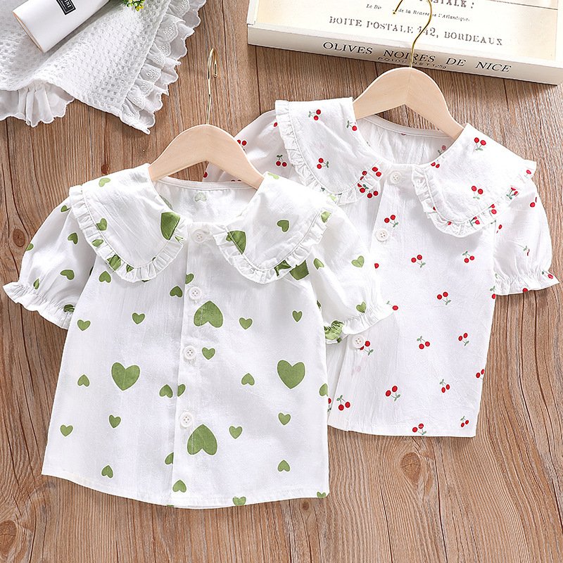 Children Kids Baby Fashion Girls Short Sleeve Cartoon Heart Print Casual Lapel Shirt