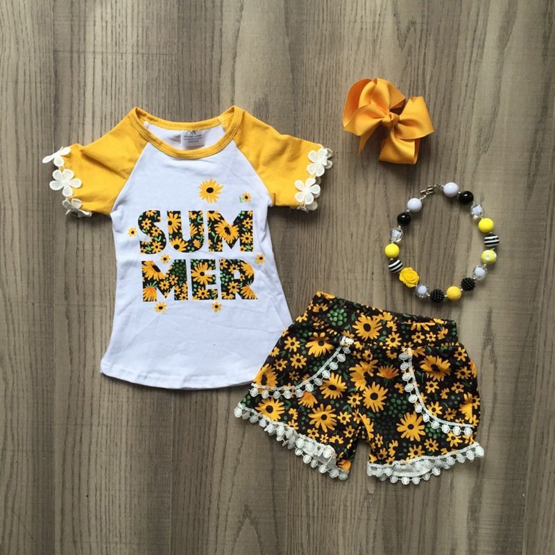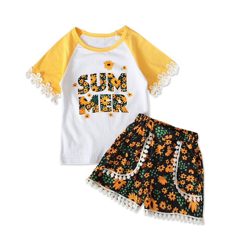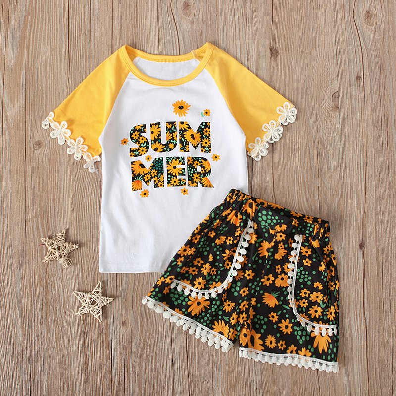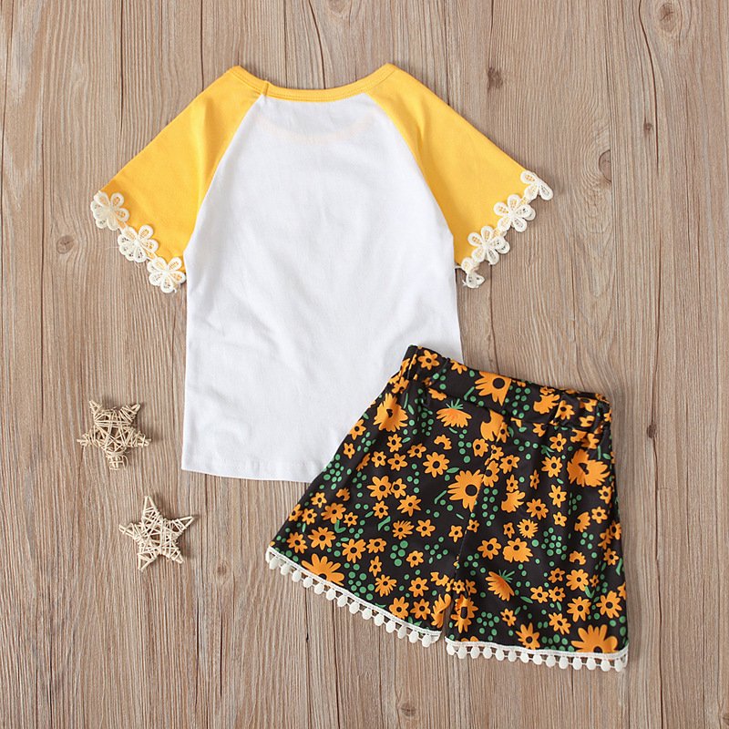 Children Kids Baby Fashion Girls Short Sleeve Letter Print Lace T-Shirt And Flower Print Shorts 2pc Set