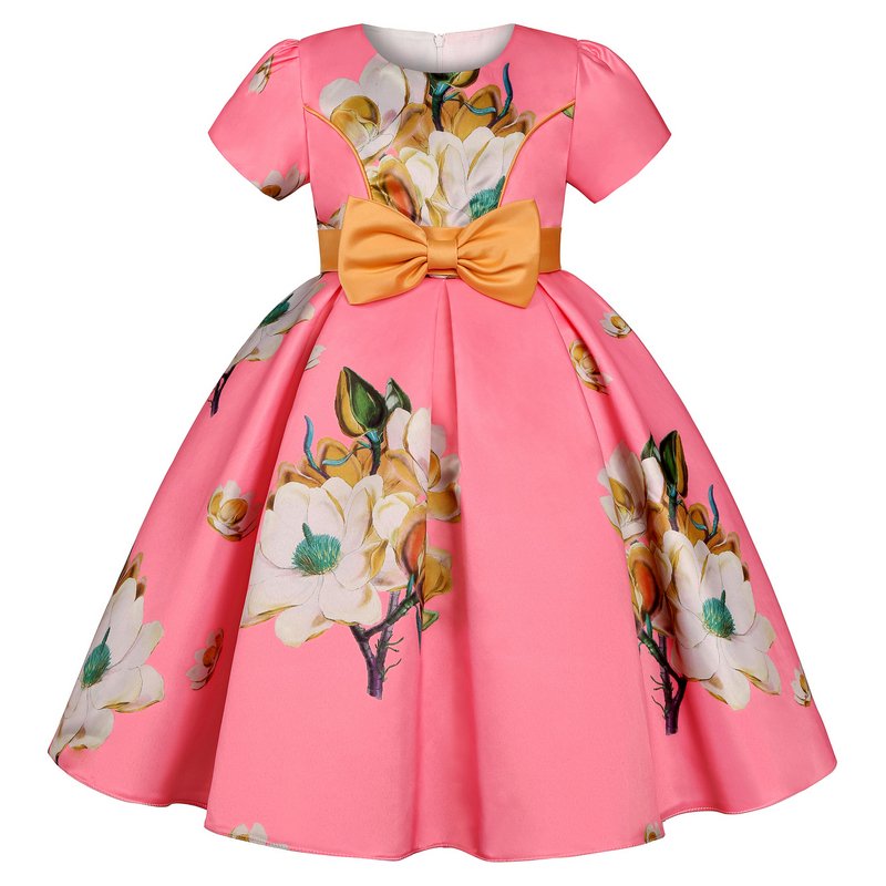 Children Kids Baby Fashion Girls Short Sleeve Retro Flower Print Bow Princess Festival Party Dress