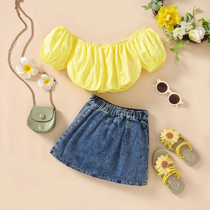Children Kids Baby Fashion Girls Short Sleeve Tube Top And Denim Skirt 2pcs Set