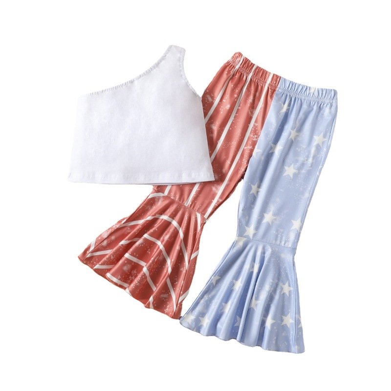 Children Kids Baby Fashion Girls Slanted Shoulders Letter Print And Star Flared Pants 2pcs Set