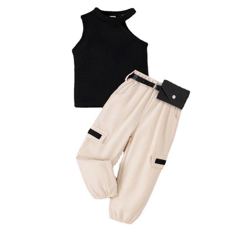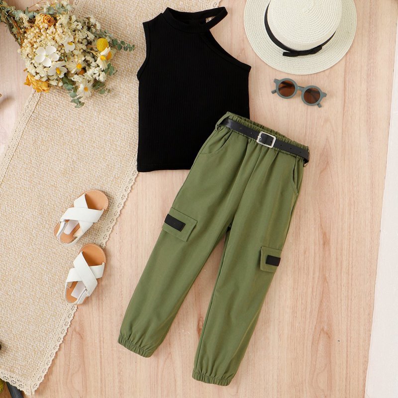 Children Kids Baby Fashion Girls Sleeveless Solid Color Suspender Top And Pockets Pants 2pcs Set