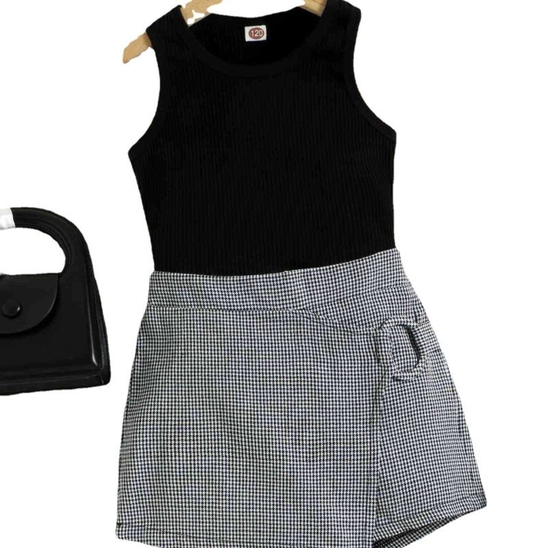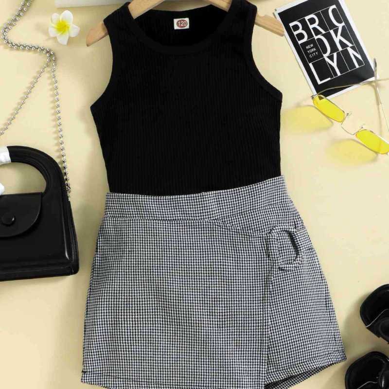 Children Kids Baby Fashion Girls Sleeveless Ves And Houndstooth Print Shorts 2pcs Set