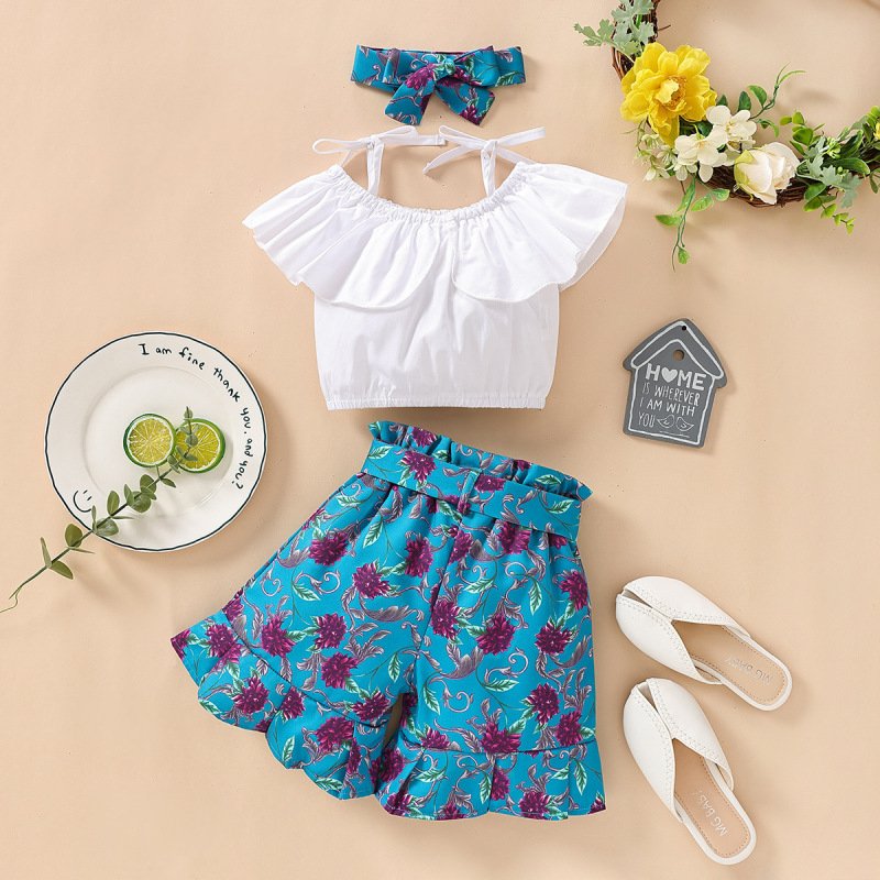 Children Kids Baby Fashion Girls Solid Color One Shoulder Top And Floral Print Shorts 2pcs Set