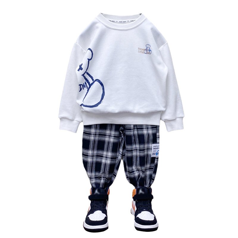 Children Kids Baby Teen Fashion Boys Casual Long Sleeve Bear Letter Print Sweatshirt And Plaid Pants 2pcs Set