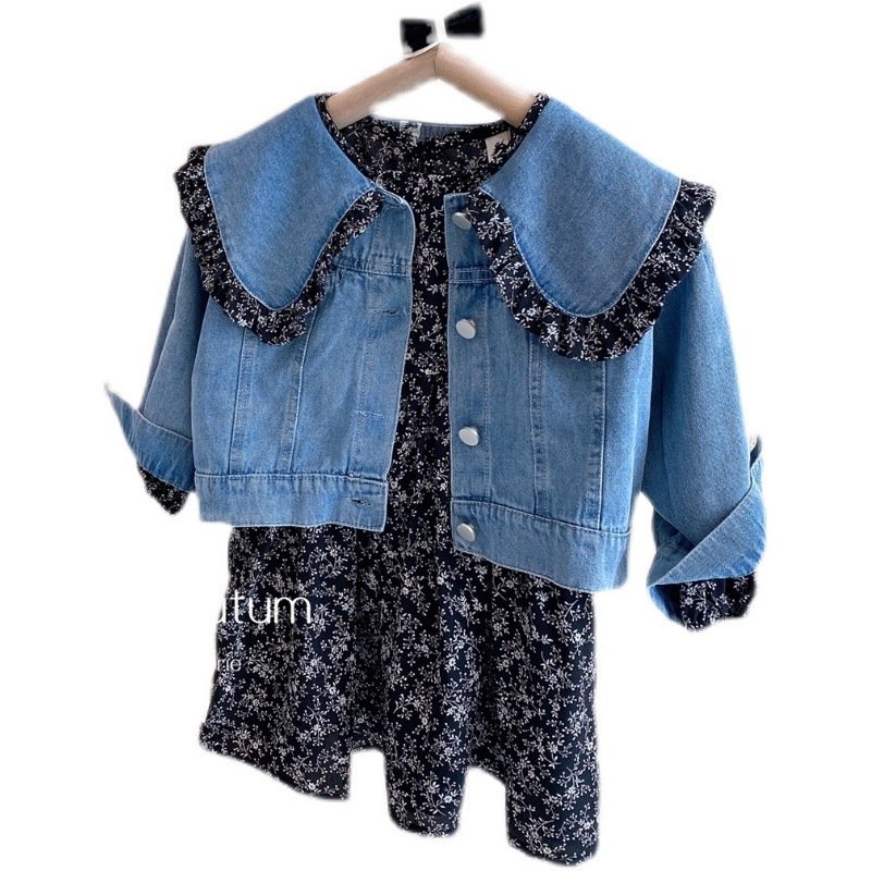 Children Kids Toddler Girls Lapel Denim Top And Flower Dress 2pcs Set