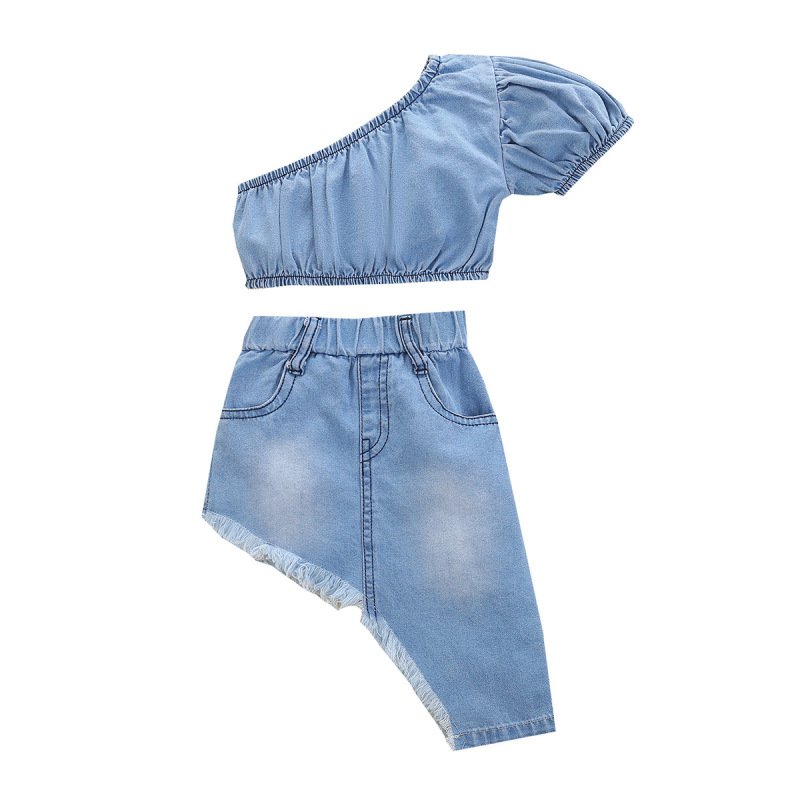 Children Kids Toddler Girls Off Shoulder Denim Top And Irregular Denim Skirt 2pcs Set