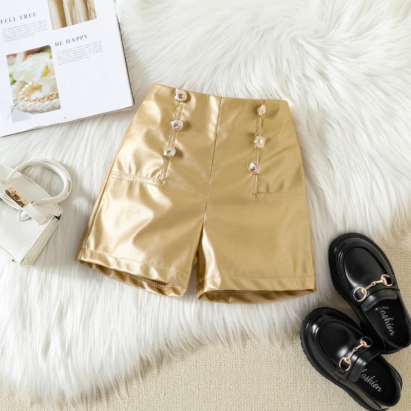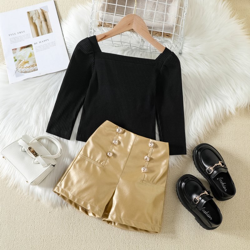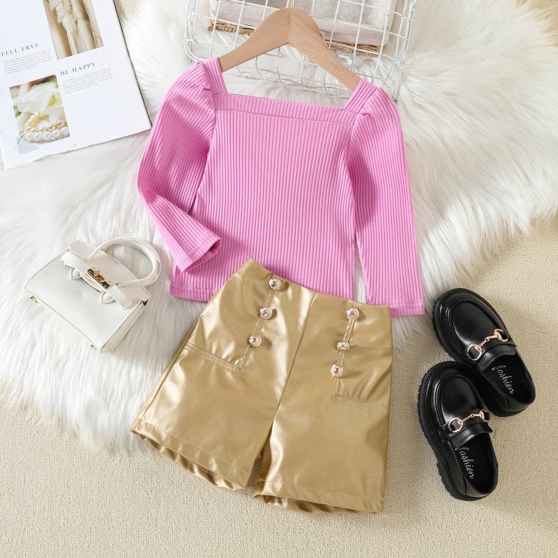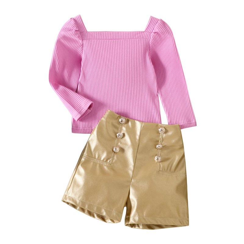 Children Kids Toddler Girls Solid Color Square Neck Puff Sleeve Top And Pu Shorts 2pcs Set
