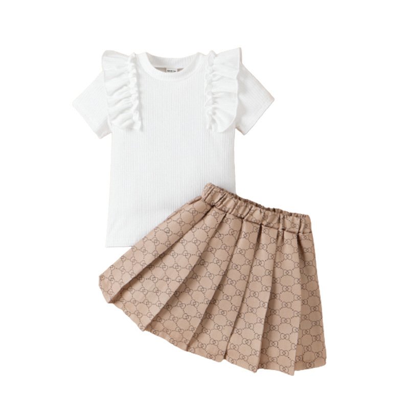 Children Kids Toddlers Fashion Girls Basic Casual Lace Short Sleeve Top And Pleated Skirt 2pcs Set