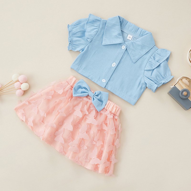 Children Kids Toddlers Fashion Girls Denim Short Sleeves Shirt And Mesh Butterfly Skirt 2pcs Set