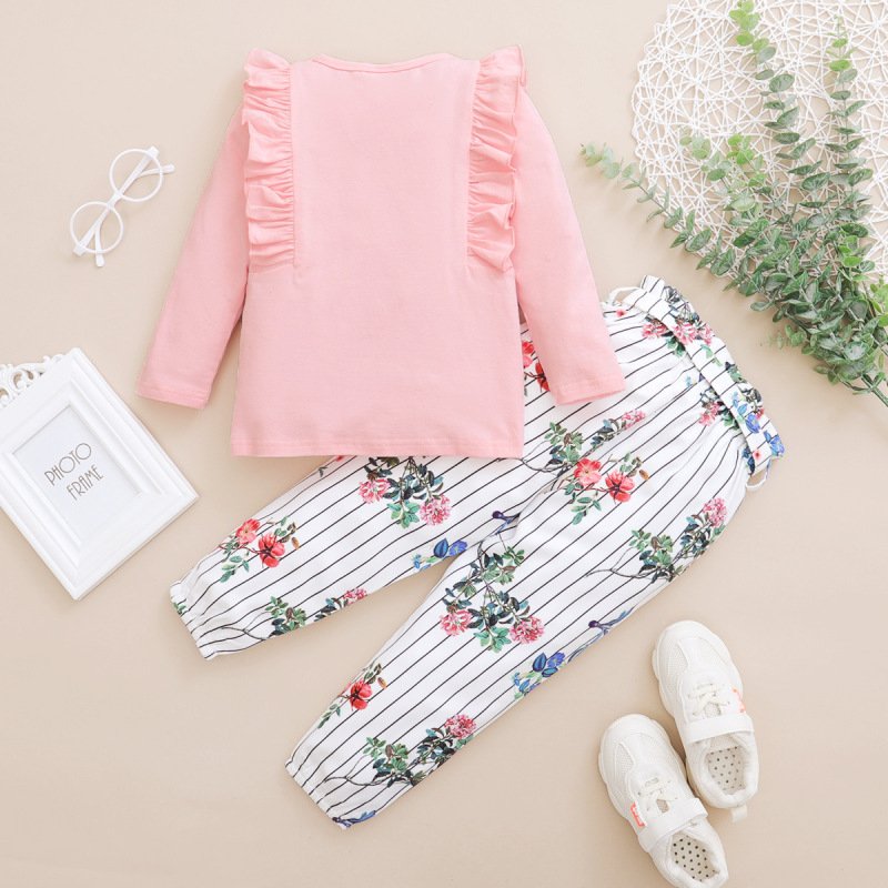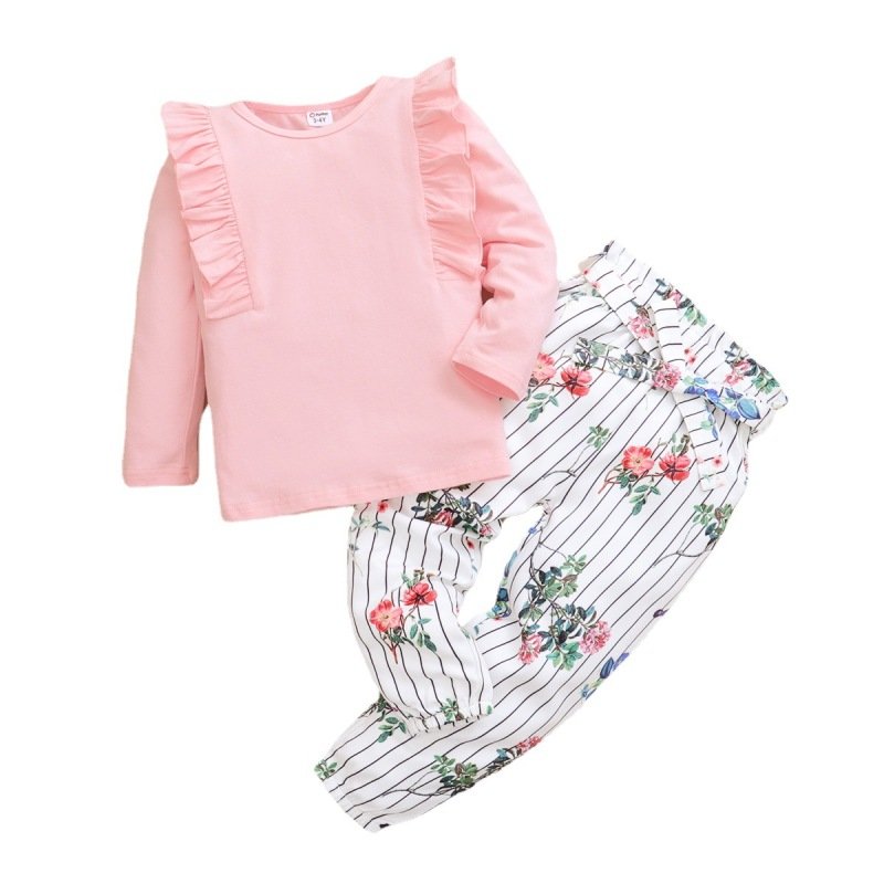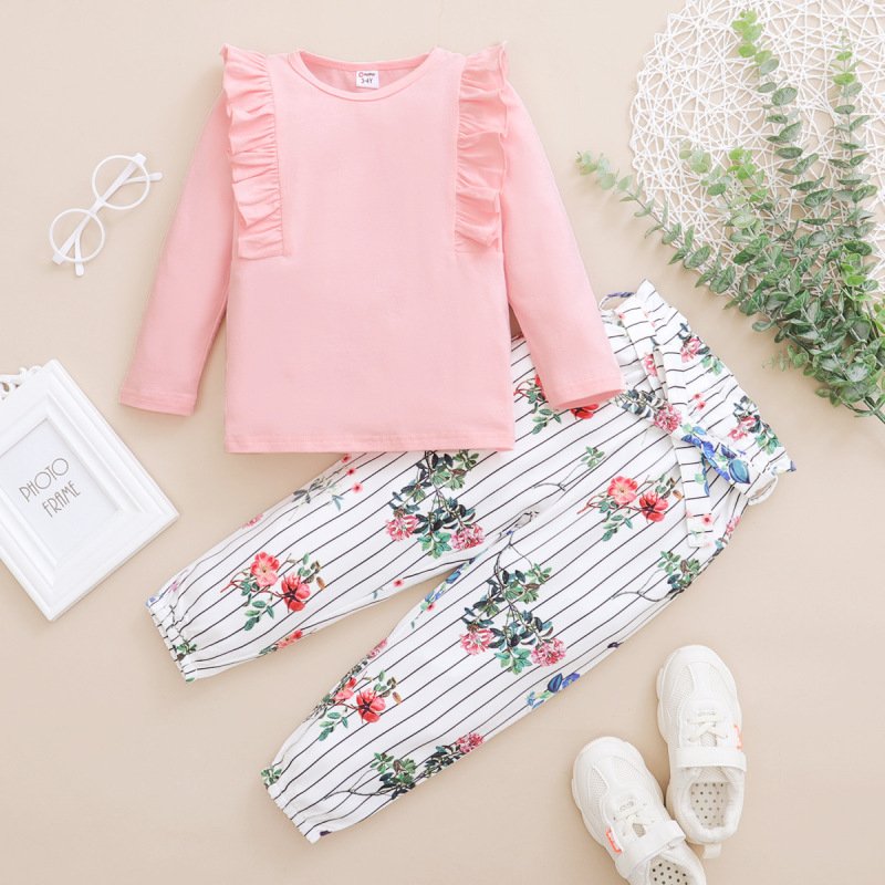 Children Kids Toddlers Fashion Girls Long Sleeve Solid Color Top And Flower Print Pants 2pcs Set