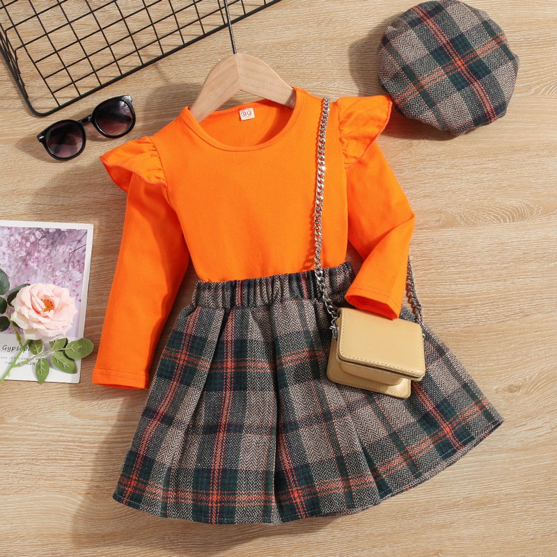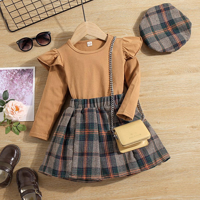 Children Kids Toddlers Girls Long Sleeve Tops And Plaid Print Skirt With Hat 3pcs Set
