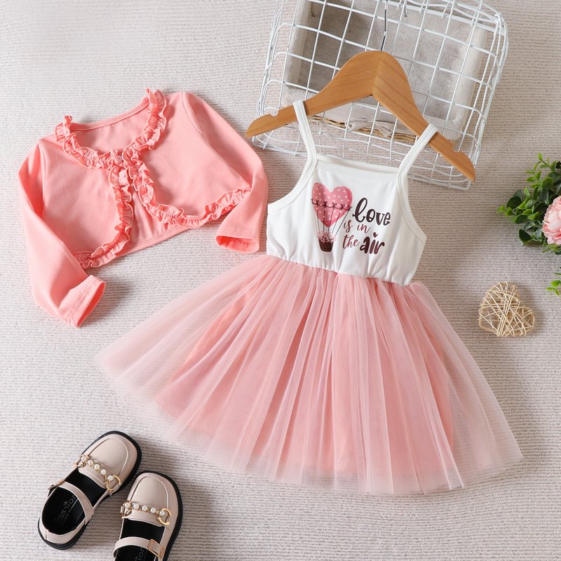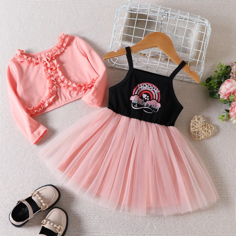 Children Kids Toddlers Girls Long-Sleeved Lace Cardigan And Heart Mesh Dress 2pcs Set