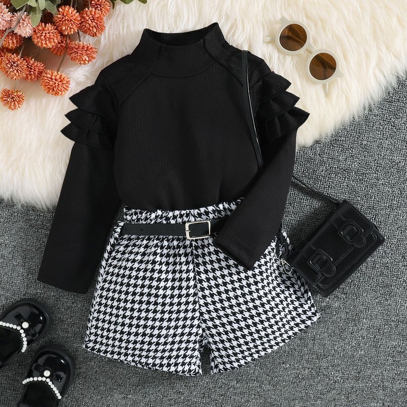 Children Kids Toddlers Girls Long-Sleeved Top And Houndstooth Shorts 2pcs Set