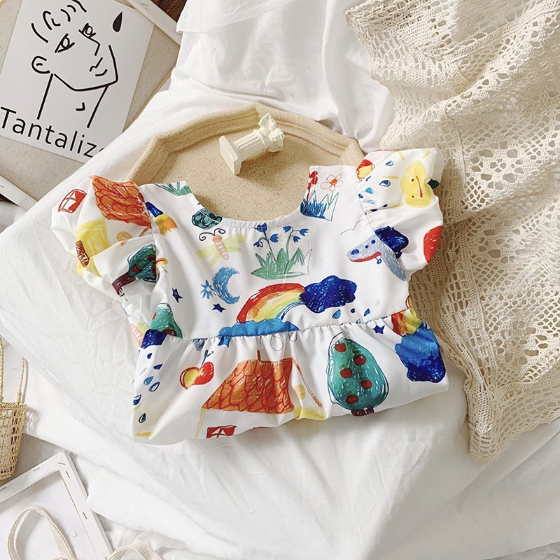Children Kids Toddlers Girls Ruffle Sleeve Cartoon Print Dress