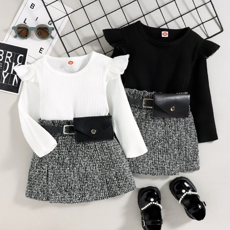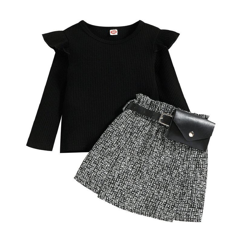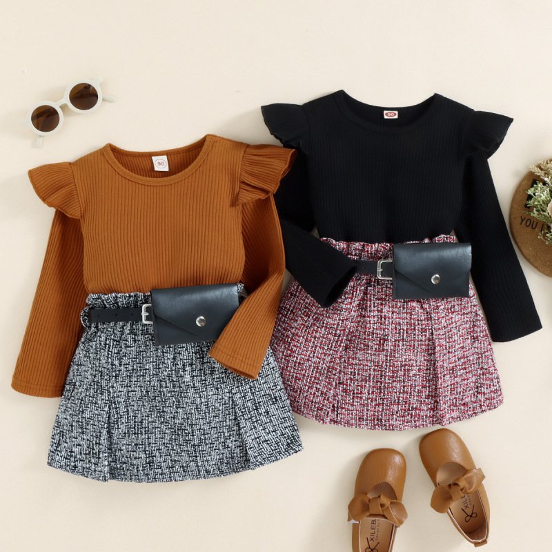 Children Kids Toddlers Girls Solid Color Long Sleeves Top And Skirt 2pcs Set