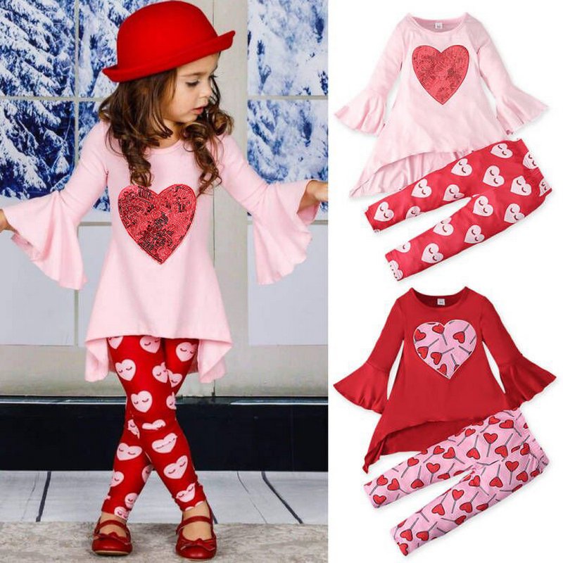 Children Kids Toddlers Girls Valentine’s Day Long Sleeve Top And Heart Pants 2pcs Set