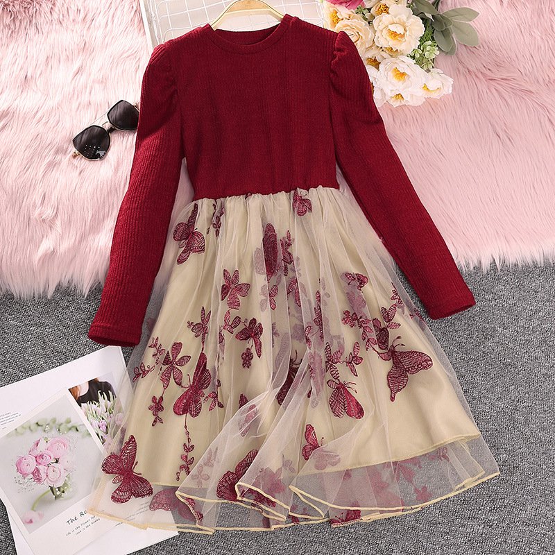 Children Kids Toddlers Long Sleeve Knitted Splicing Mesh Princess Dress