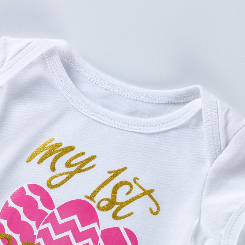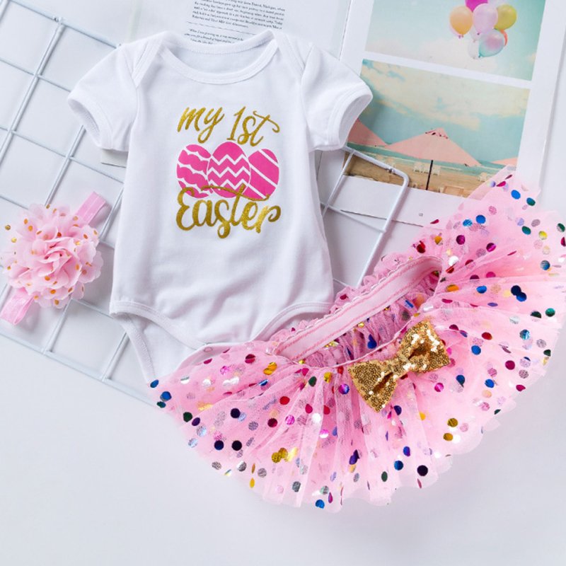 Easter Baby Girls Round Neck Short-sleeved Cartoon Egg Letter Pattern Romper And Color Polka Dot Mesh Skirt With Headband Set