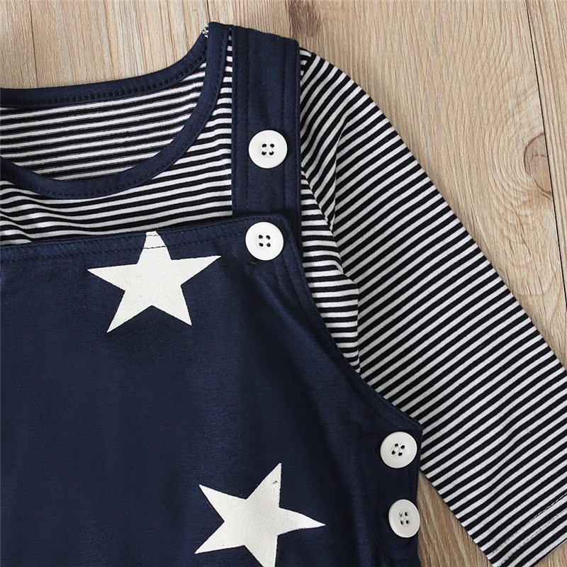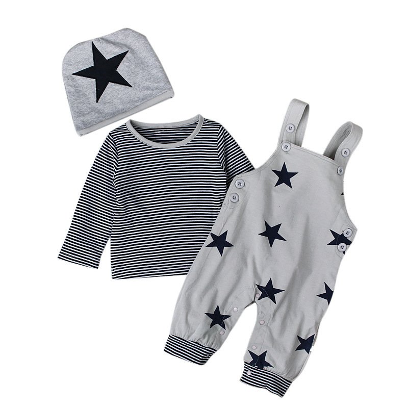 Fashion Baby Striped Long-Sleeved Top And Star Print Overalls With Hat