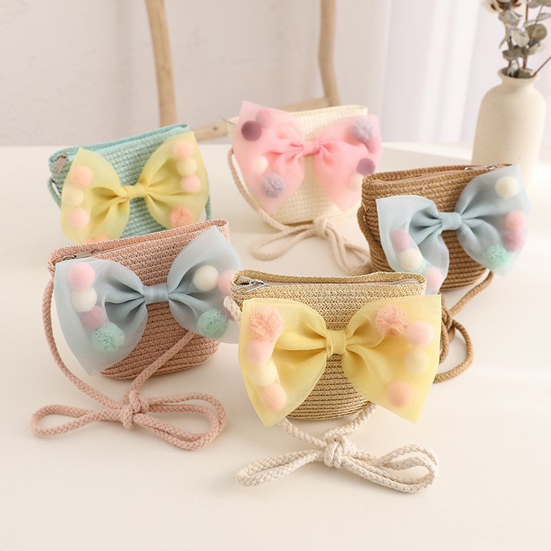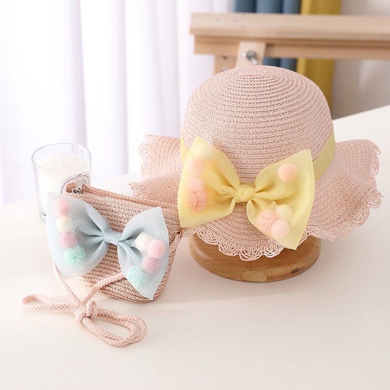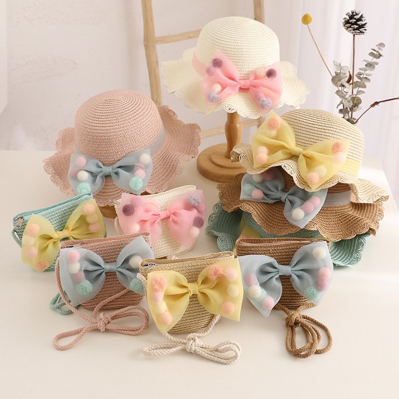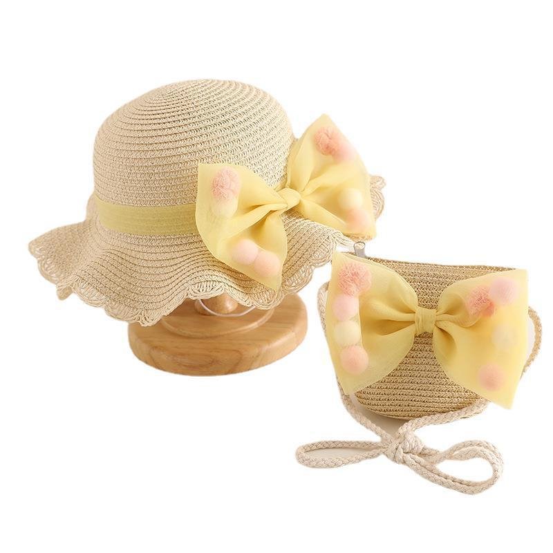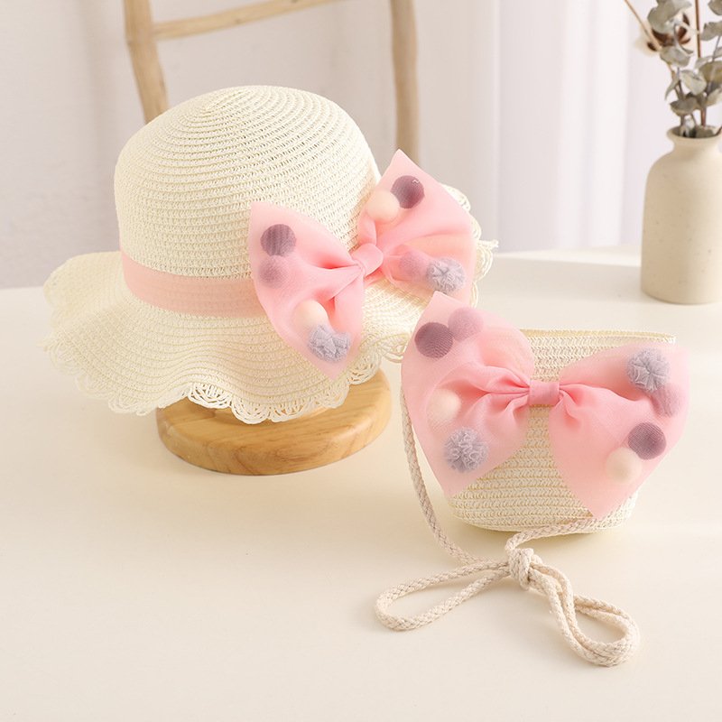 Fashion Bow Design Kids Girls Straw Woven Hat And Bag Set