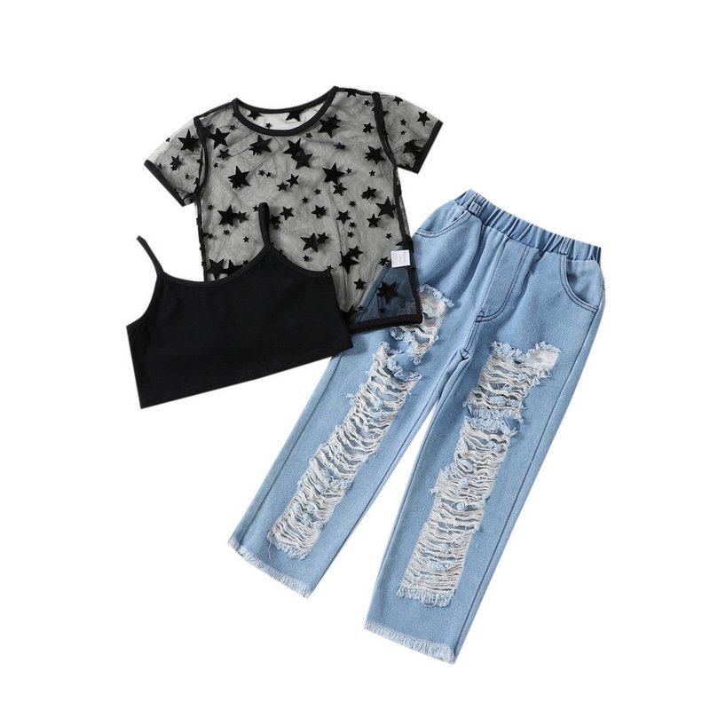 Fashion Toddler Girls Lace Short-Sleeved Mesh T-Shirt Camis Denim Ripple Jeans Three-Piece Set