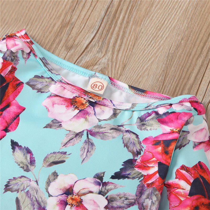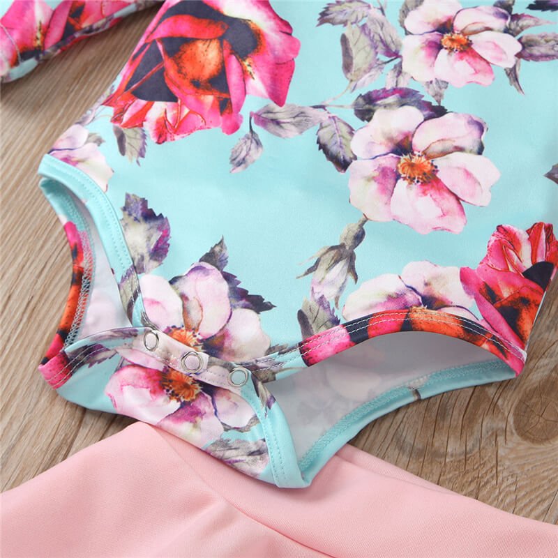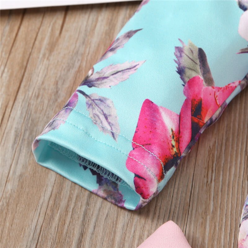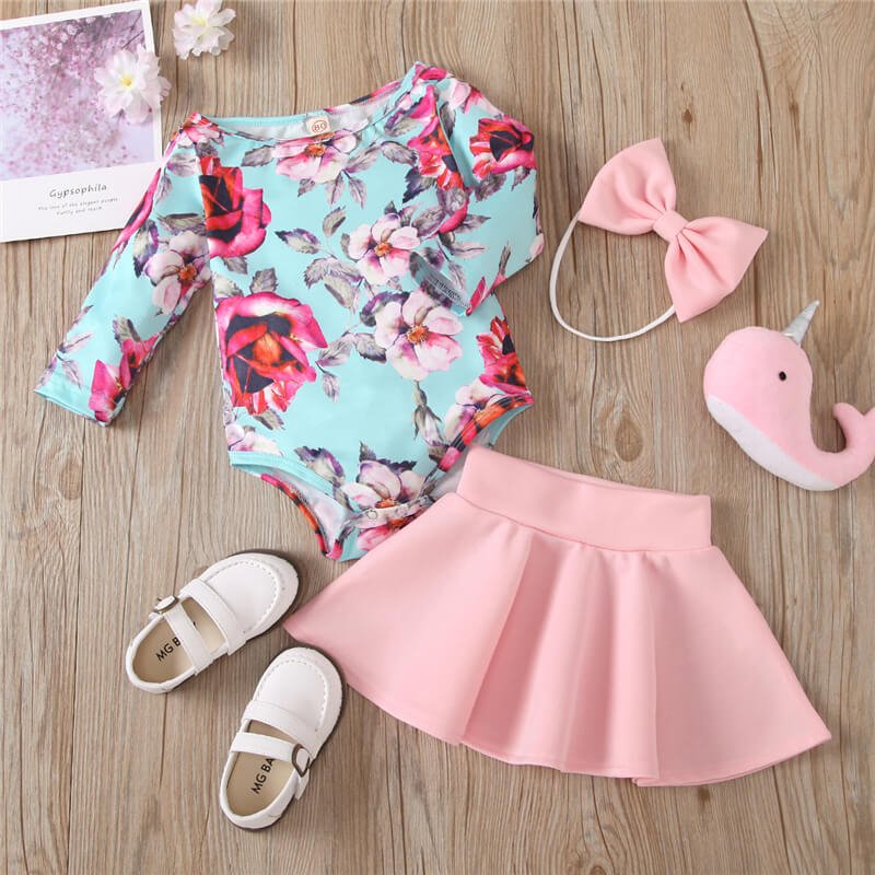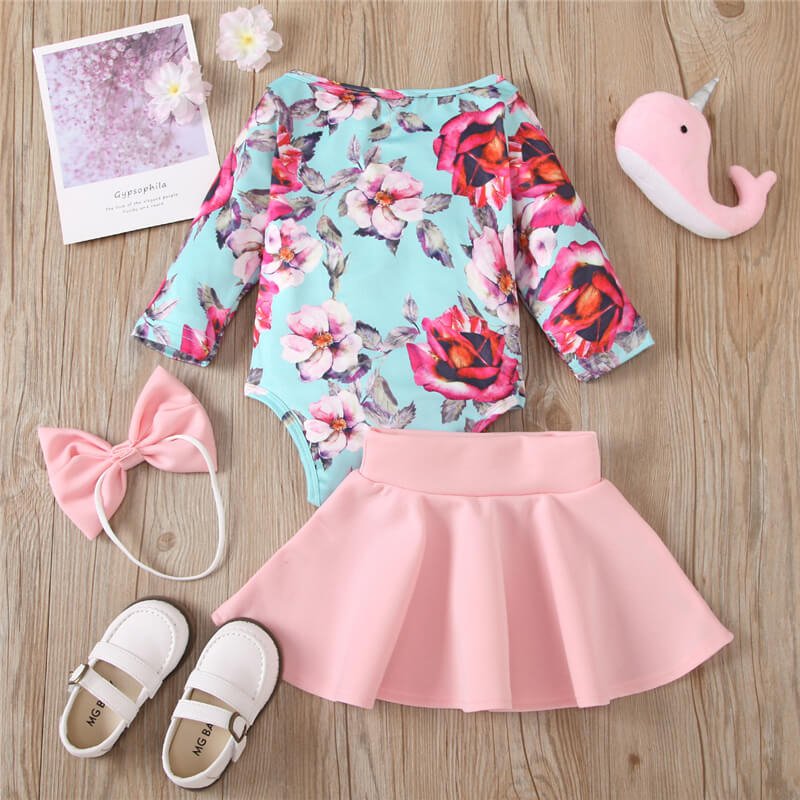 Flower Printing Long Sleeve Rompers And Solid Color Skirt With Headband Set